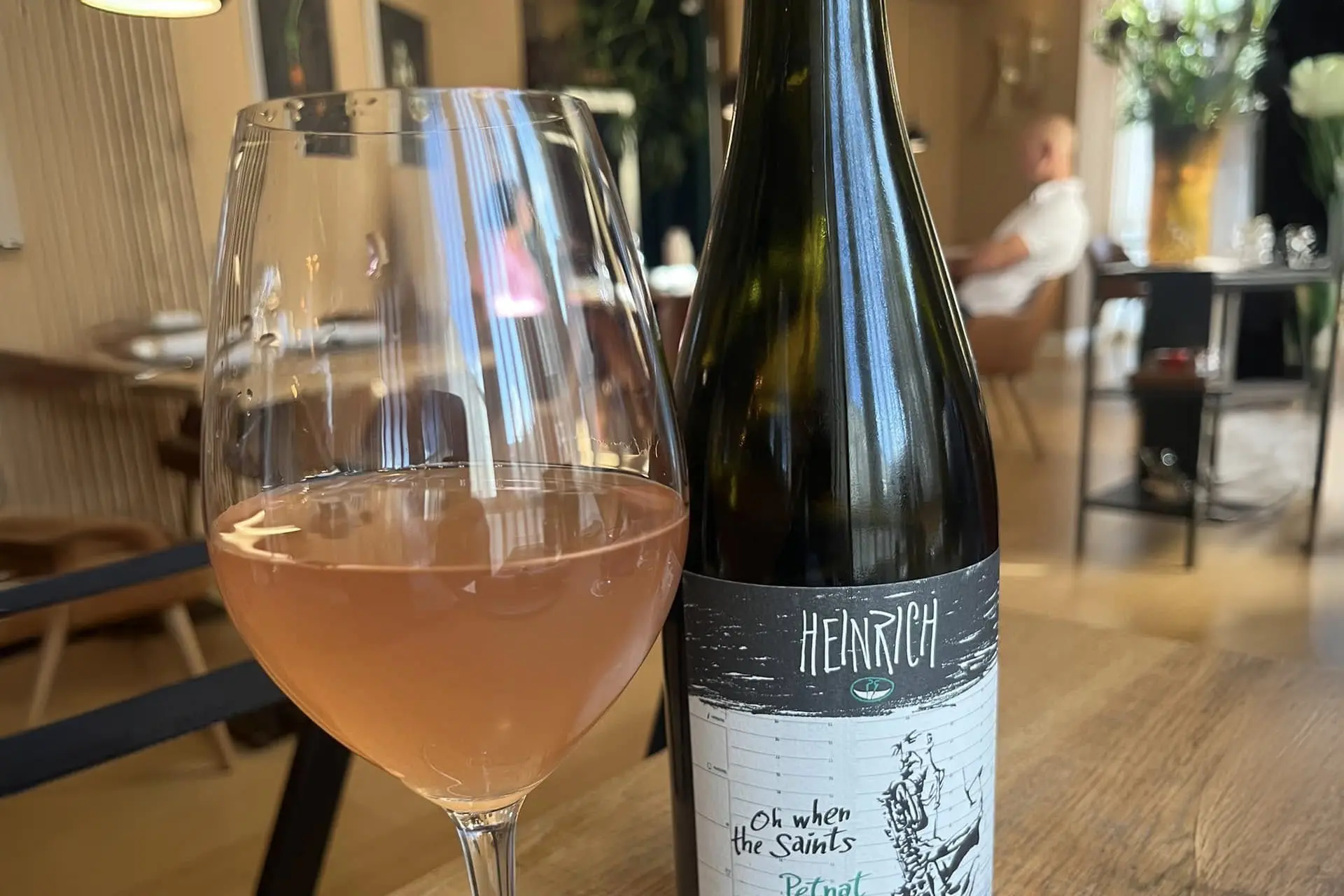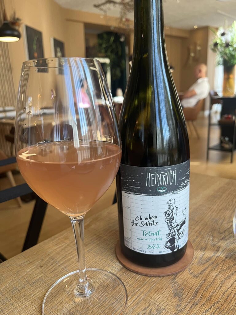 Til snacks fik vi serveret en østrigsk naturvin af typen PetNat – Petillante Naturel – lavet på Saint Laurent druen. En syrlig sag med masser af smag – og med det sigende navn “Oh When the Saints….”.