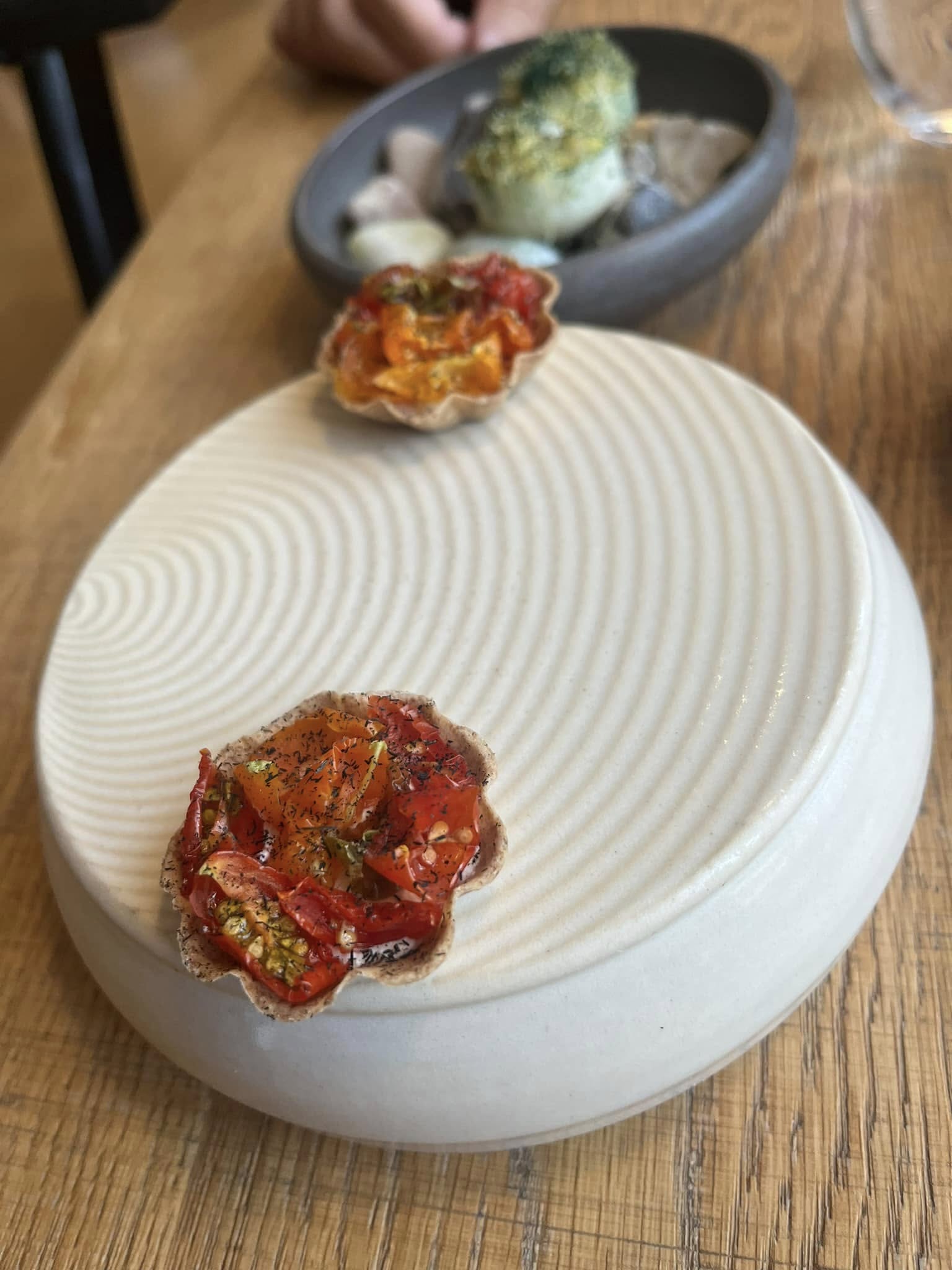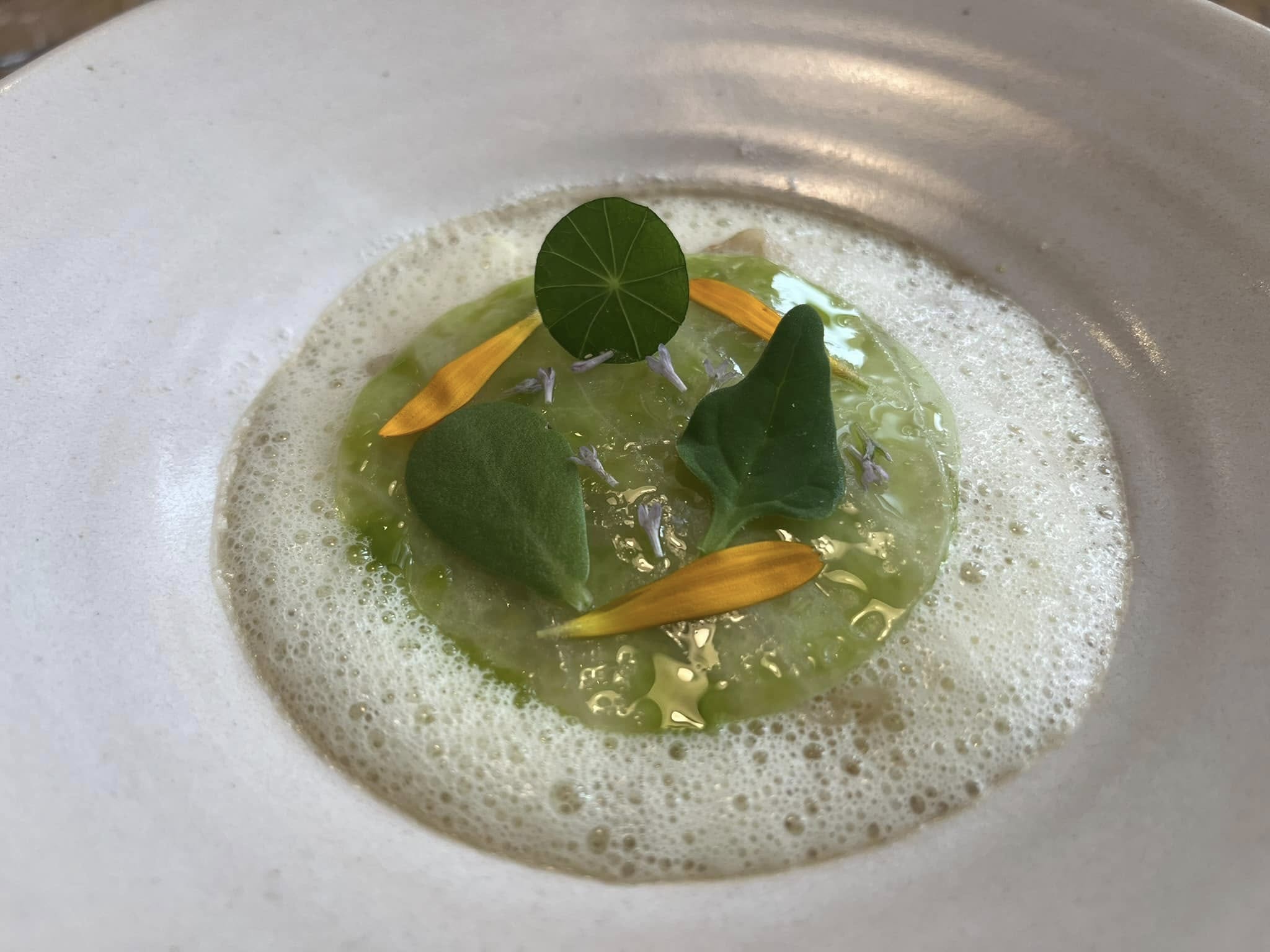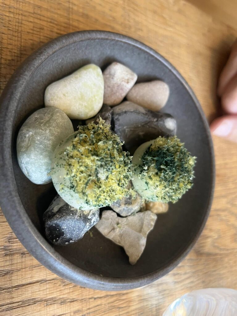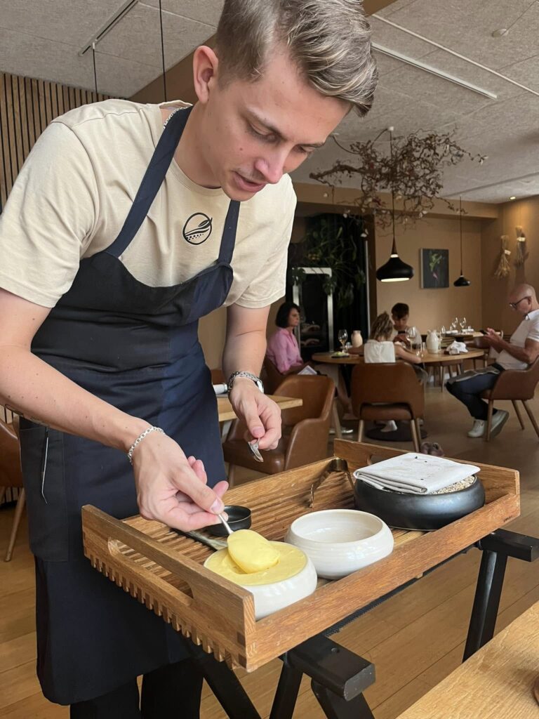 Det er vel ikke for meget at sige, at vi derfor har glædet os til at tilbringe denne onsdag aften på Alimentum i Aalborg, som jo vandt Bedst i Nordjylland i 2022 men ikke mindst opnåede en Grøn Michelinstjerne i 2024. Spændingen var måske endnu større, fordi vi denne aften fandt ud af, at indehaverne Søren Birch og Simon Kvist Bjerre var taget på “dannelsesrejse” til trestjernede engelske L’Enclume. Kunne Alimentum så stå distancen?