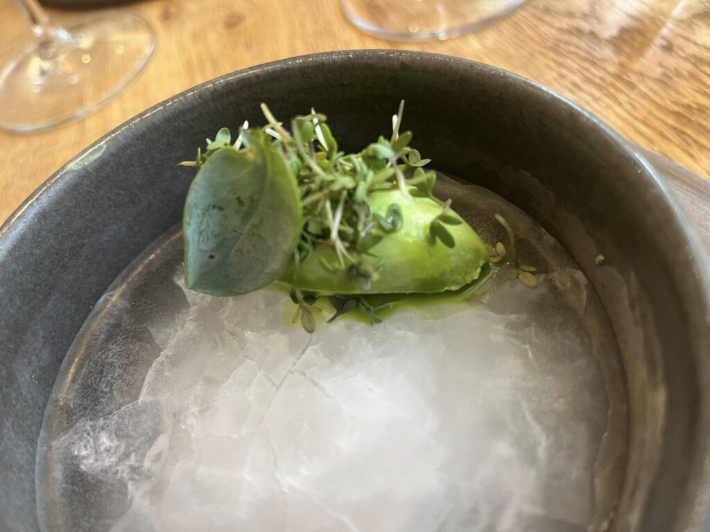 De to desserter rundede aftenen flot af. En opfindsom “isbar” med basilikum og karamel viklet ind i et blad af havesyre og senere en flot dild-pyntet servering med fennikel, skyr og blåbær. En Riesling Auslese fra Rheinhessen formåede at spænde helt fra basilikum til fennikel med både sødme og syre.
