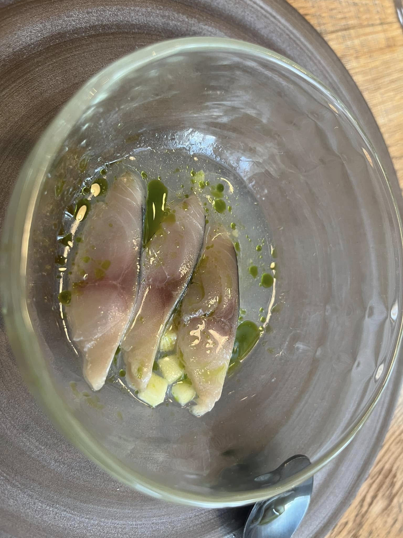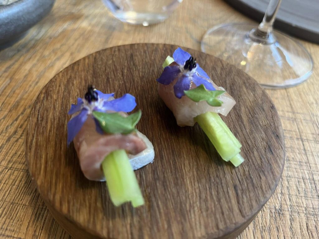 Nu fulgte en lille skål med skiver af makrel, fint sammensat med courgetter og stikkelsbær. En balance mellem sødme og syre, som blev ledsaget af et glas fra Bodega la Purisima, lavet på Macabeo, der ellers bruges i spanske Cava’er.