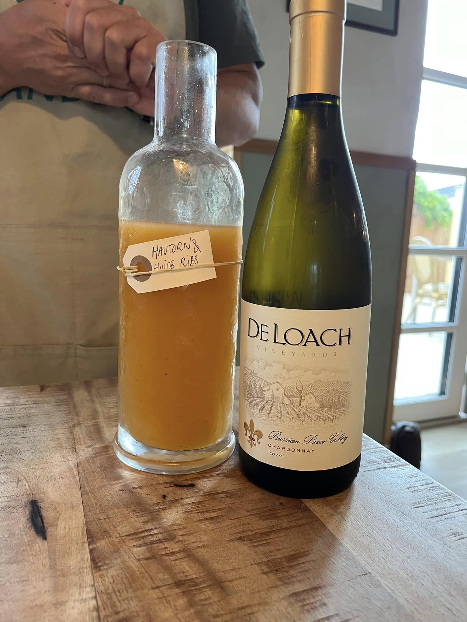 Havtaske, varm kartoffelkompot, stikkelsbær, løg, sauce på ristet kylling.