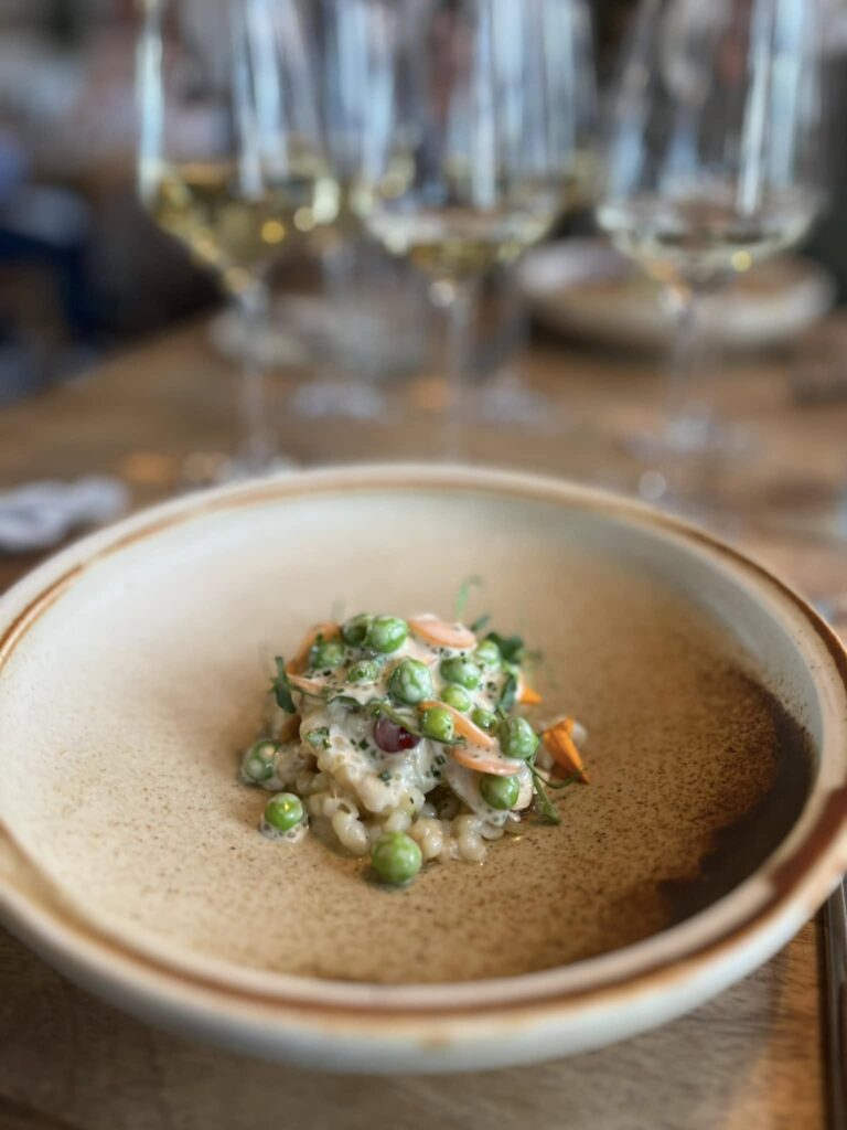 Blæksprutte, røget hasselnød, saltet blomme, hyldeblomst beurre blanc m. friske ærter, gulerod og stenbiderrogn.