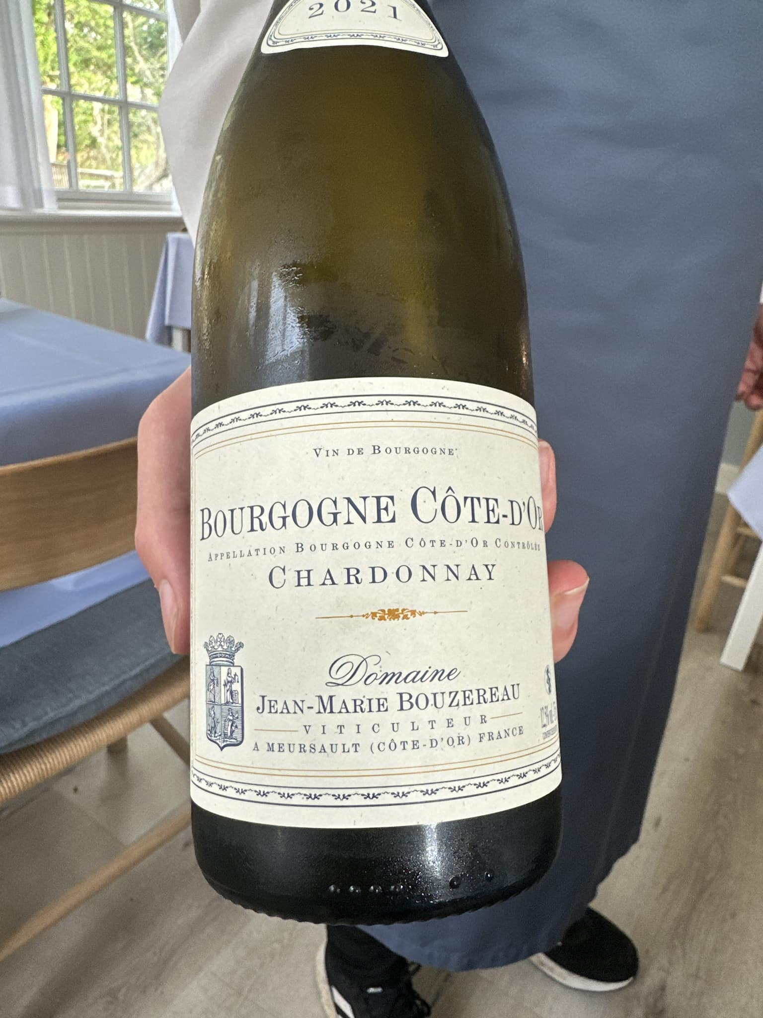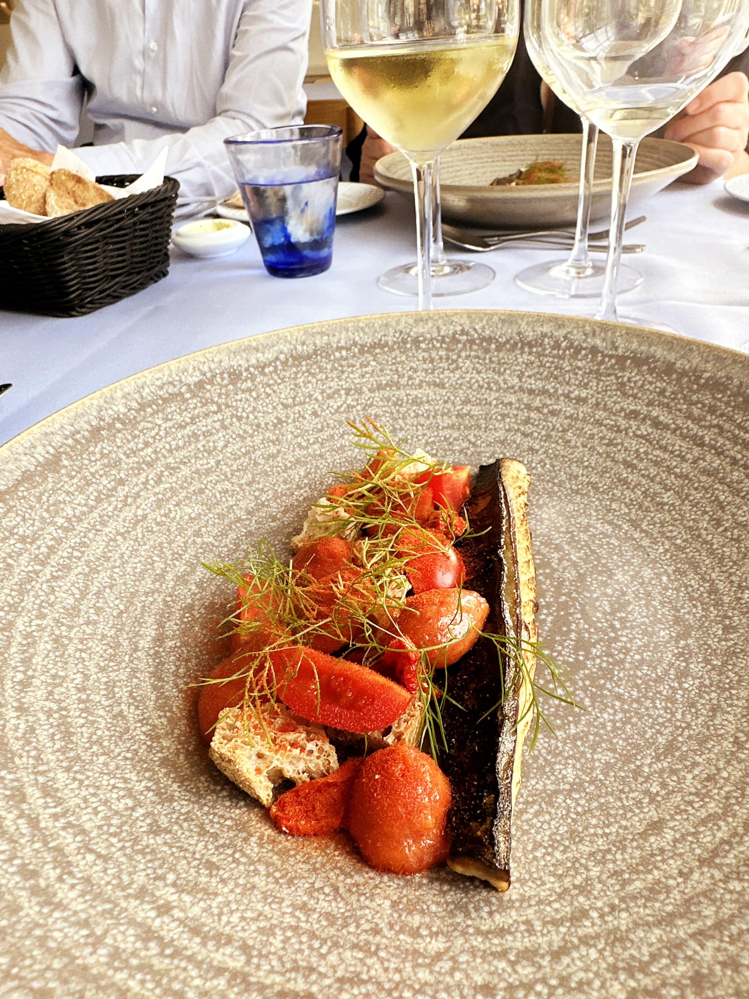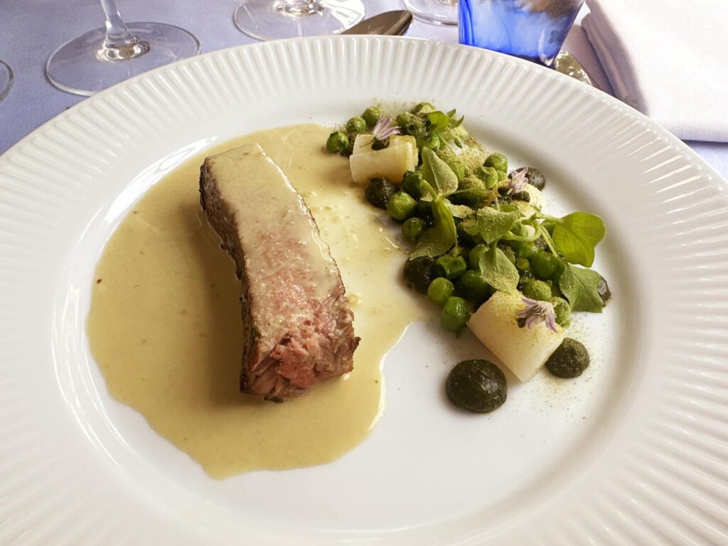 Saltet, letrøgede makrel med både dehydrerede og syltede tomater samt surdejscruton og tomatmayo. Enkelt og smukt. Dejligt at flere og flere herhjemme tager vores gode makrel på menukortet, som dog kan være svært at vinmatche. Det gik rigtigt fornuftigt på Hjorths, den aften med: Jean-Marie Bouzereau Bourgogne Chardonnay 2021 med noter af eg – og igen pære.