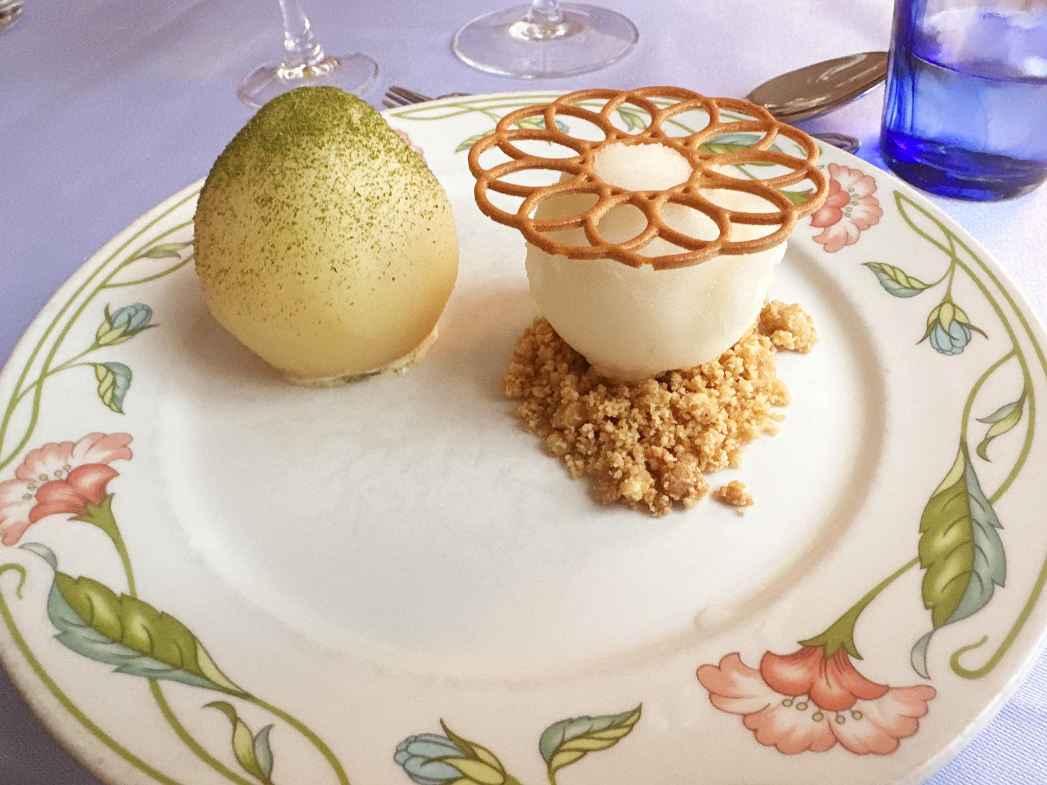 Pærer pocheret i hvidvin og sukker, serveret med citronmousse indeni samt crumble på kammerjunker og endelig sorbet på verbena fra haven og karameltuiles.