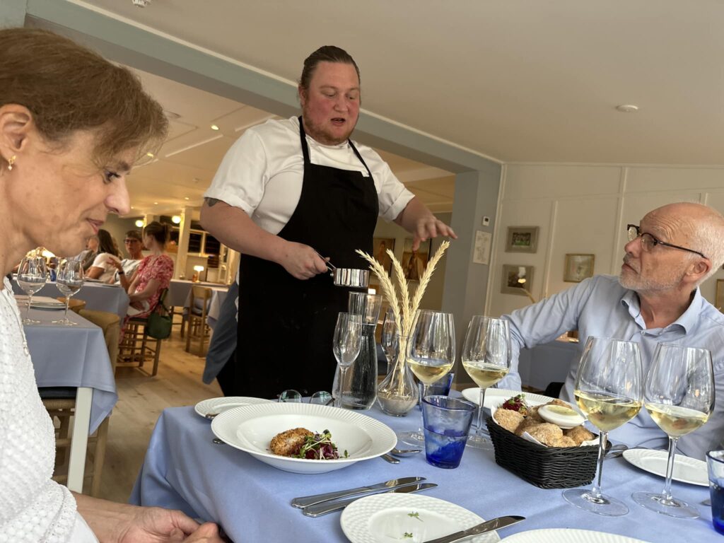 Først og fremmest har Valentin op til denne sæson lokket den talentfulde lollik Réne Trane helt til toppen af Danmark med samt hans souscheferfaring fra bl.a. Claus Meyers Hotel Saxkøbing og Pasfall i Odense. Det kan mærkes. Og Trane virker fornøjet med det hele – trods langt hjemmefra. Der tales allerede om partnerskab med Valentin efter sæsonen. Godt for os gæster, hvis det kan lykkes på Hjorths, der igen satser på helårsåbent.
