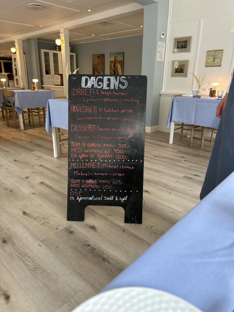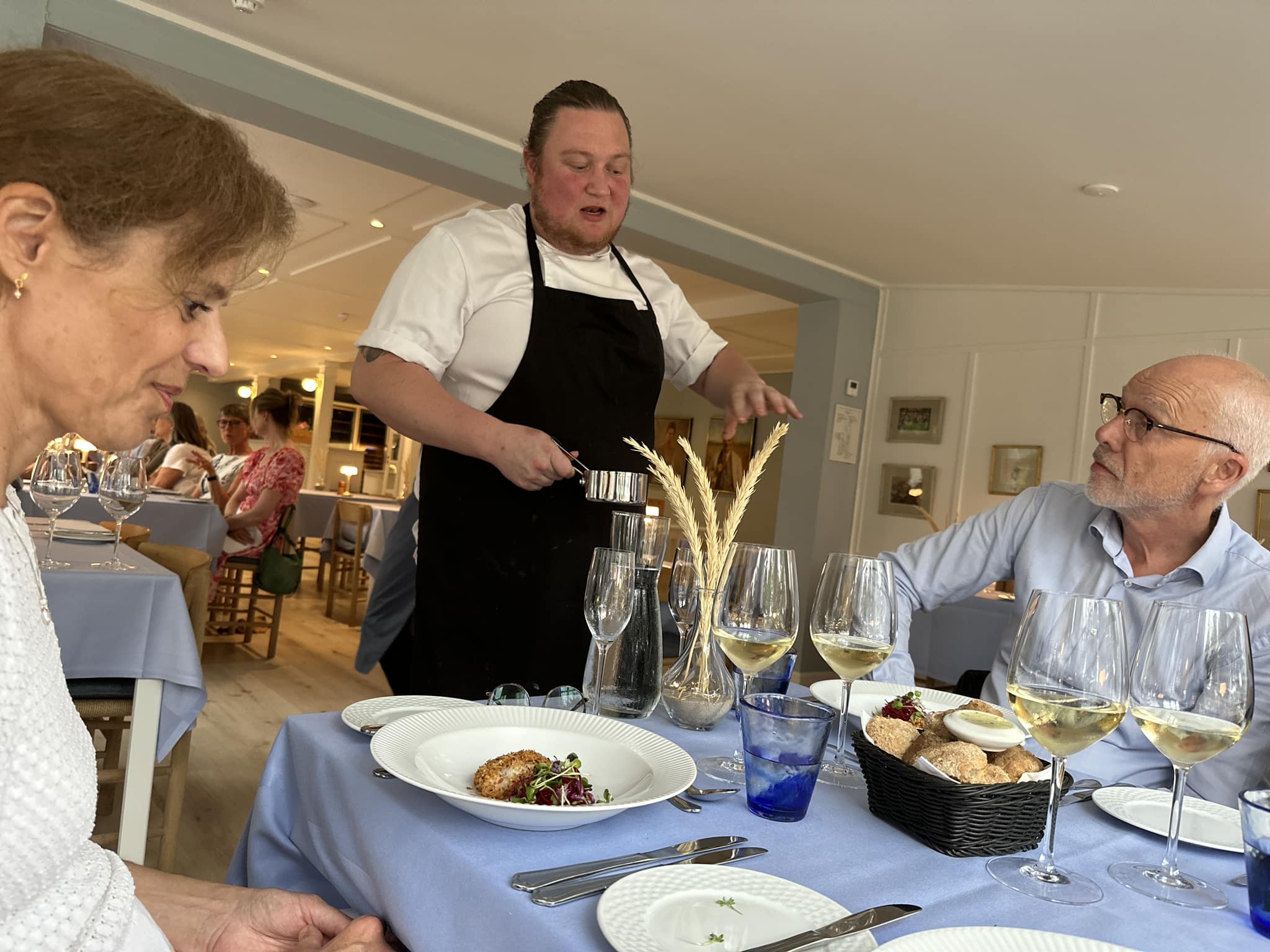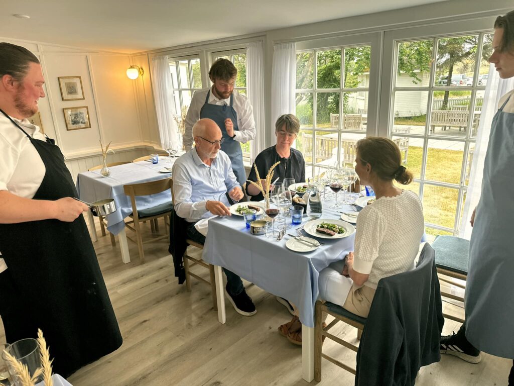 Forpagteren de seneste fem år, Mikael Valentin med en fortid på bl.a. hedengangne Restaurant Rusk og Svalegården i Aalborg, har flotte ambitioner for det dejlige, rolige sted en halv snes kilometer syd for det snart sommerpulserende Skagen, som knap så mange længere kender. For os var det ti år siden sidst – så længe skal der efter denne oplevelse nødigt gå til næste gang.