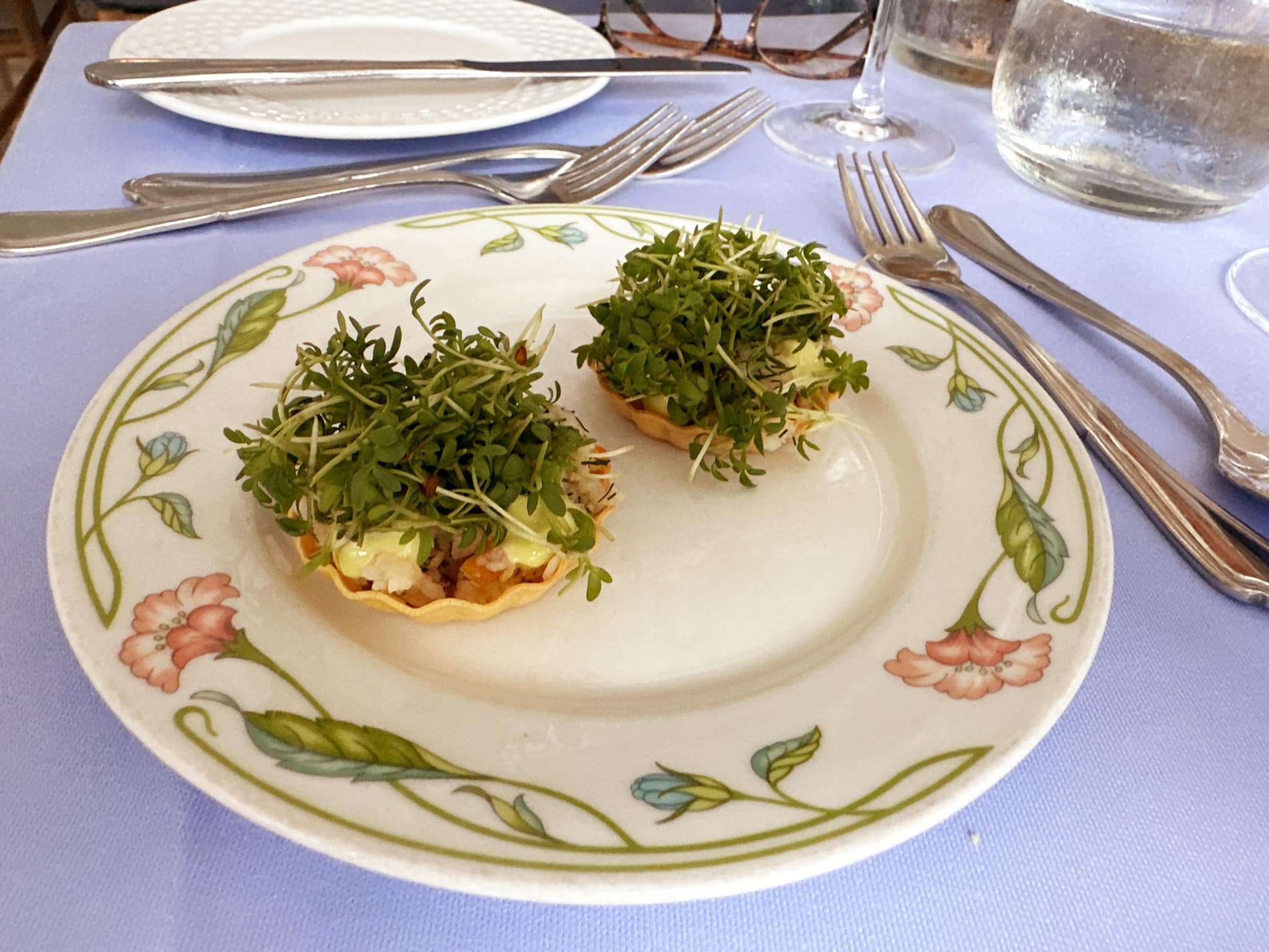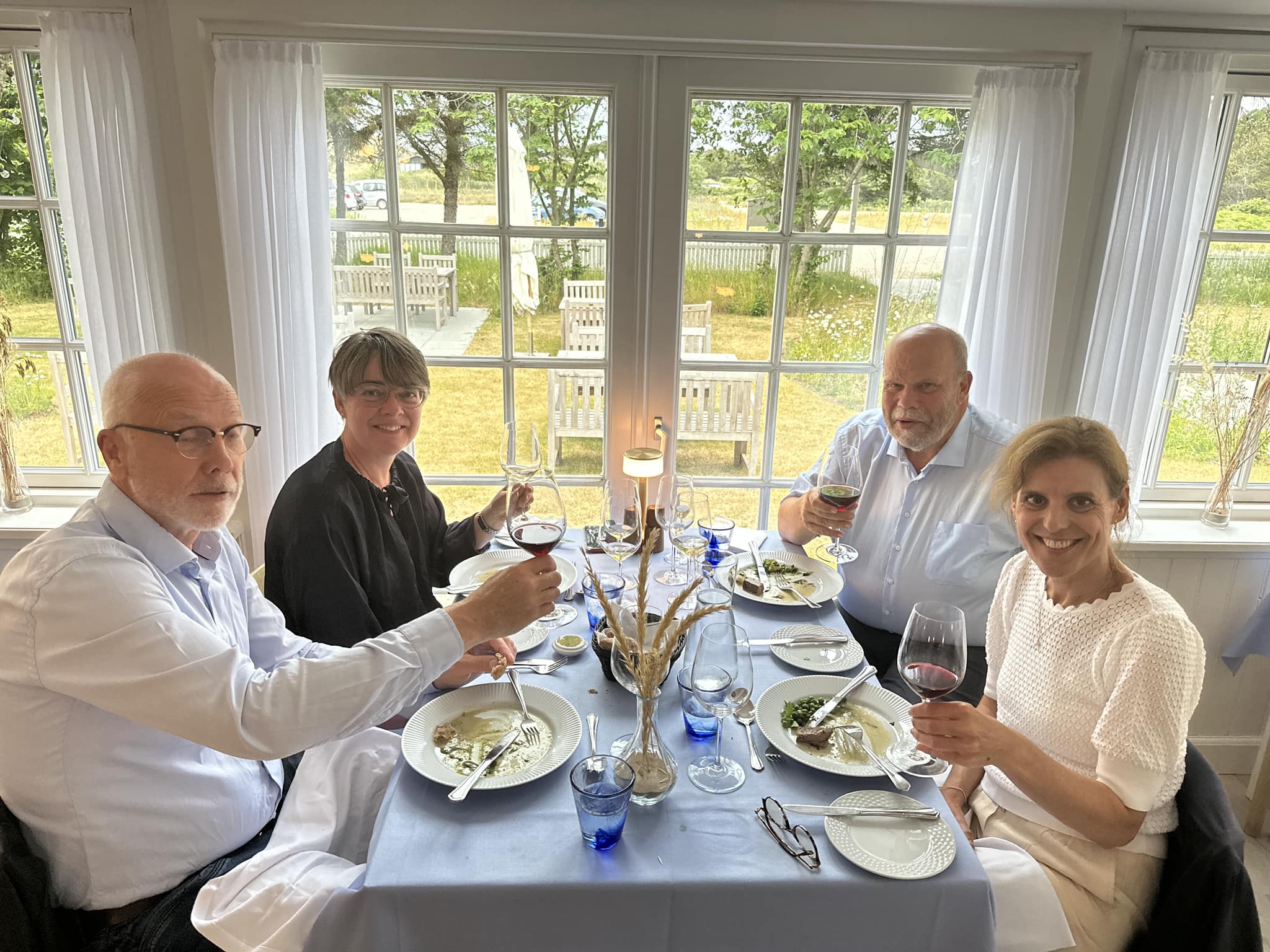 Forventningsfulde forlader vi kaffe og drinks i den skærmede have med de mange vilde blomster i udkanten af Råbjerg Mile og 5-10 minutters gang fra stranden. Her er der i løbet af eftermiddagen også er blevet serveret både dejligt smørrebrød og lækre kagetallerkner. Vi lader os lede på plads i det hyggelige lyseblå restaurantslokale og glæder os til at gå om bord i den store ” ”En aften på Hjorths”-menu til 1200 kr.: For snacks med champagne og fire retter mad med – skulle det vise sig velvalgte og generøse – vinmatch samt afsluttende kaffe.