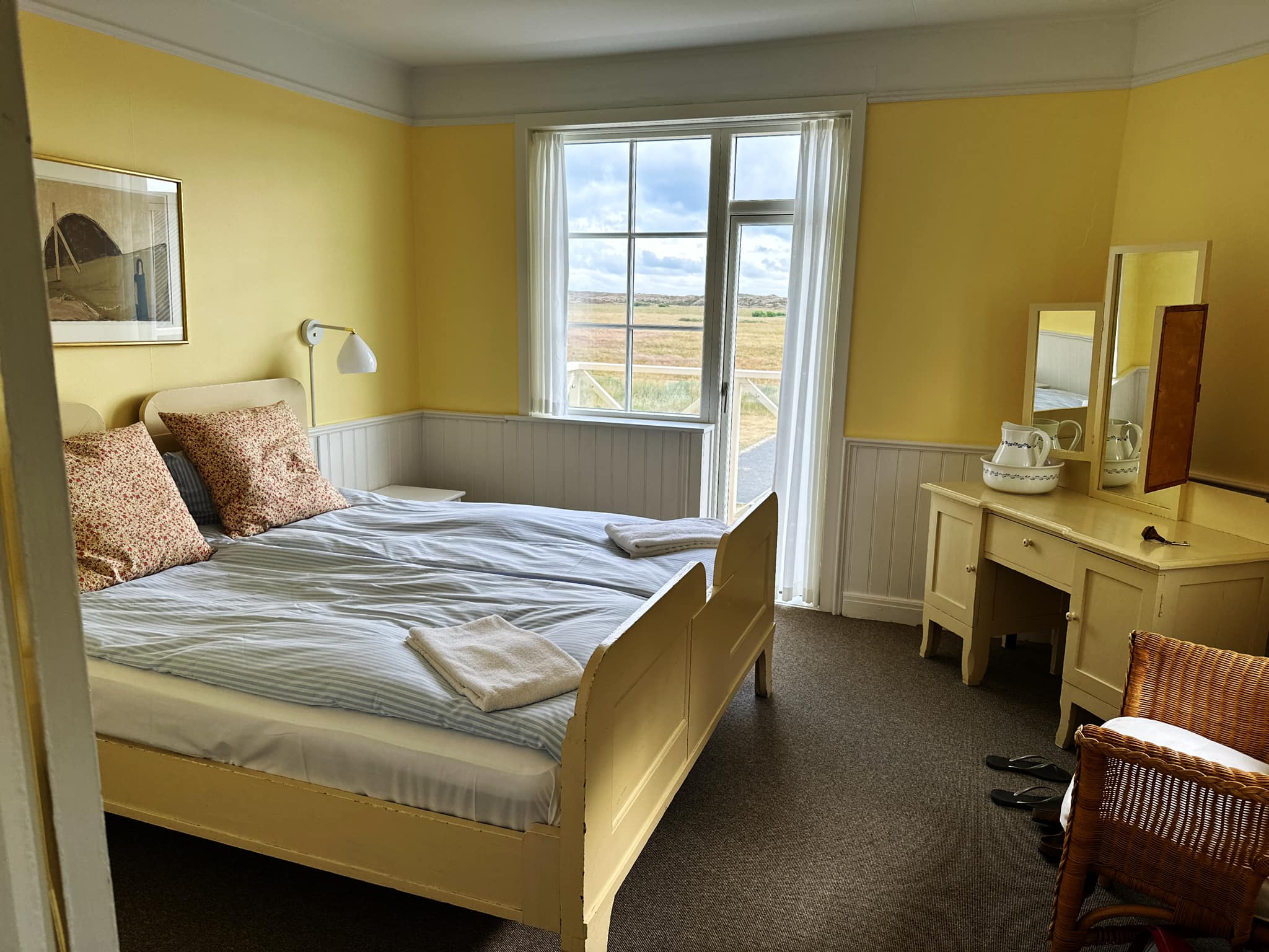 Efter kaffen, serveret i loungen, gik vi gastronomisk tilfredsstillet i seng i værelse 17, se fotoet, og vågnede op til den skønneste udsigt og lærkekvidder og en glimrende morgenbuffet på et passende udvalg af fine hjemmelavede specialiteter inklusiv hjemmelavet Ketchup til æg, pølser og bacon, stikkelsbærmarmelade og hjemmekærnet smør m.m. En fuldendt badehotelsoplevelse. Vores medbragte hollandske gæster var også meget imponeret.