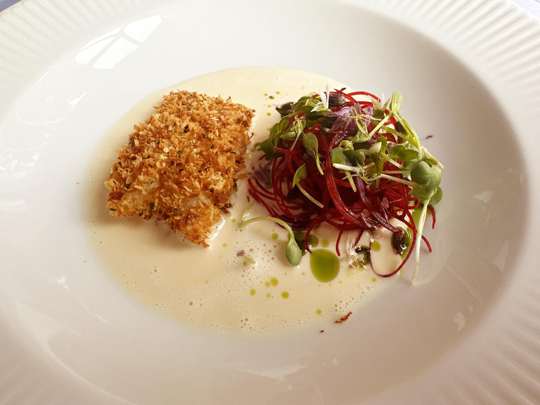 Lyssej fra Skagen vendt i urtecrumble serveret med sellericreme, strimler af rødbede i havtorn vinaigrette og urter samt muslingesauce på siden. Salt med syre og mild sødme. Skøn servering.