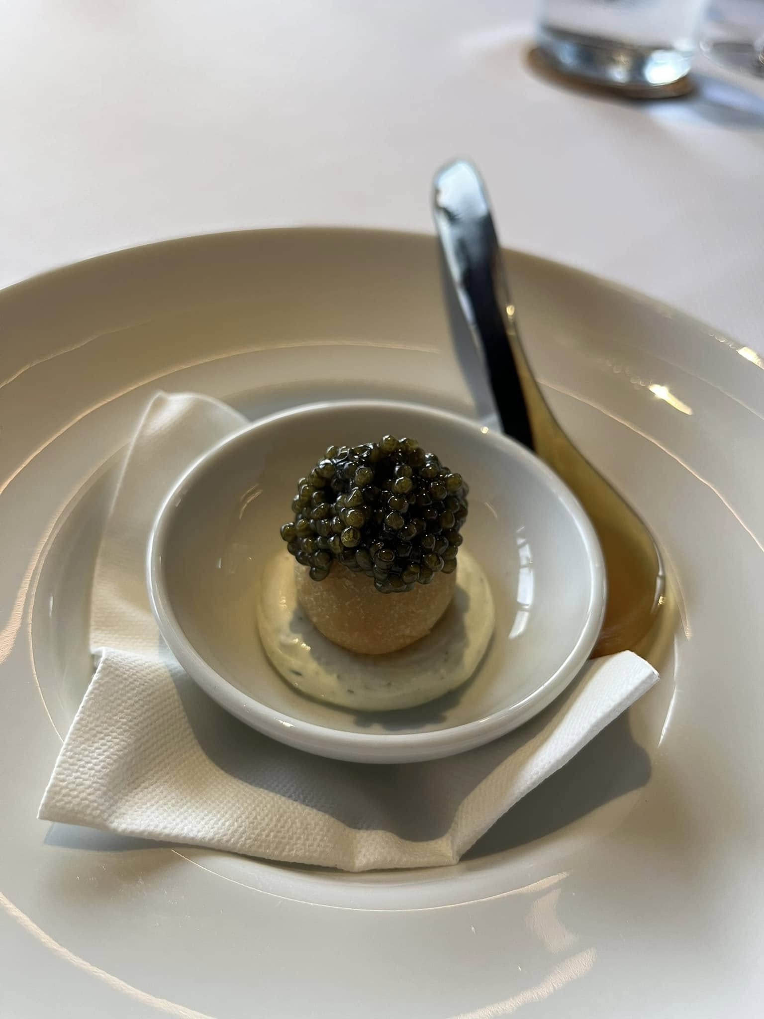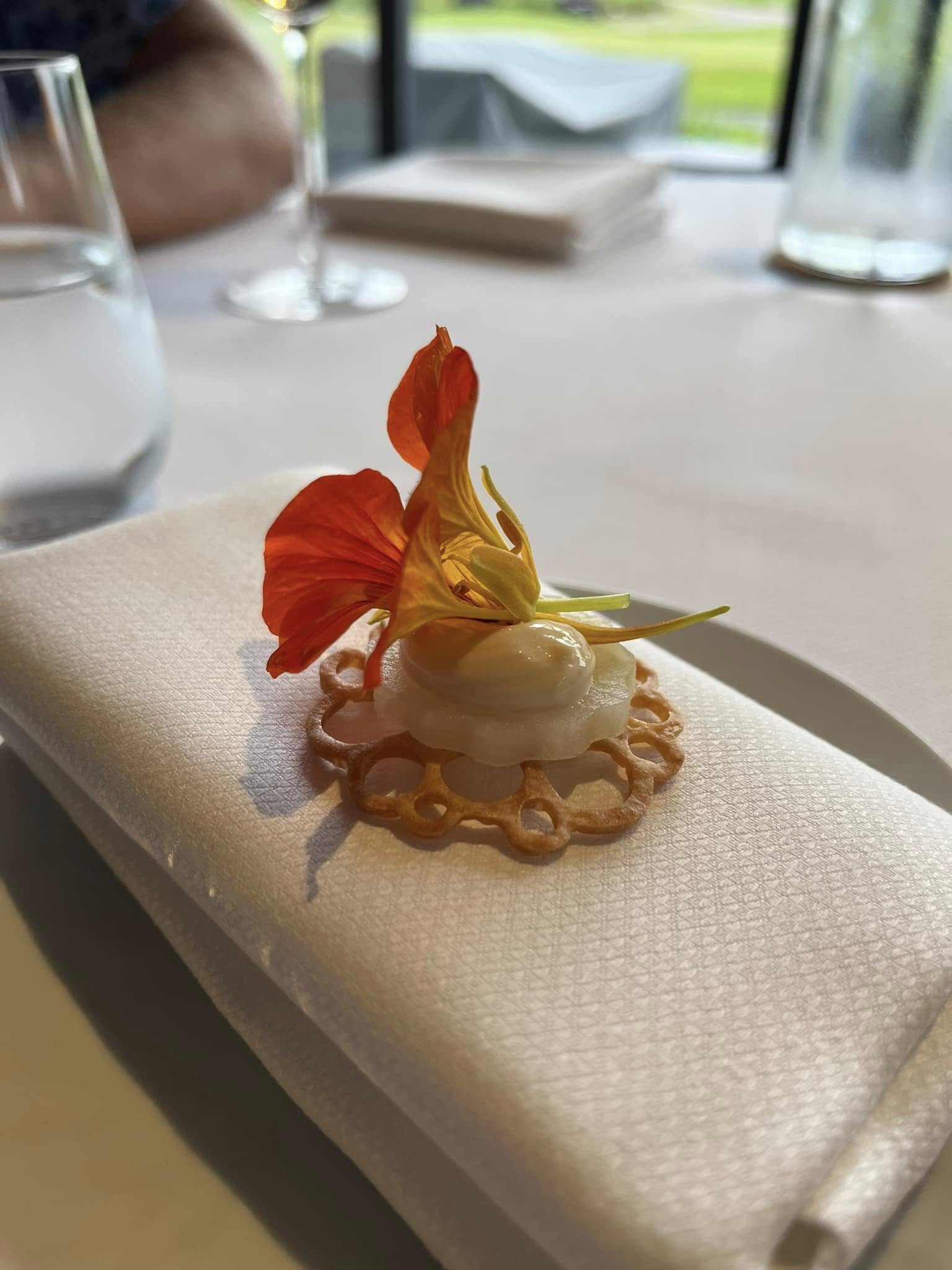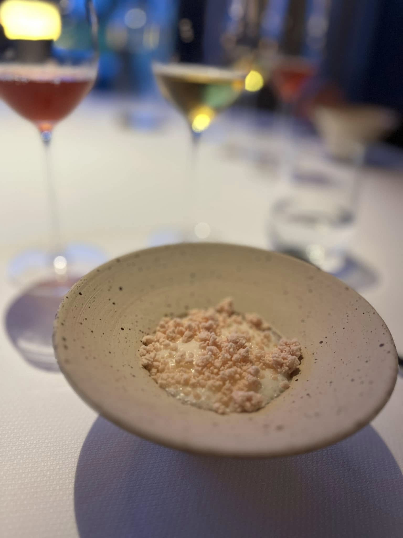 En fantastisk start. Alle 7 snacks var lavet til perfektion. Jeg synes billederne taler for sig selv, når jeg siger, at det var æstetisk smukke snacks. Efter hver snack tænkte jeg “det er den bedste”. Jeg nåede derfor frem til den erkendelse, at alle snacks var min favorit. I glasset havde vi: N.V. Cuvée Louis Victor, Coutelas, Champagne, Frankrig. Et dejligt glas bobler, der harmonerede godt til alle de små snacks.