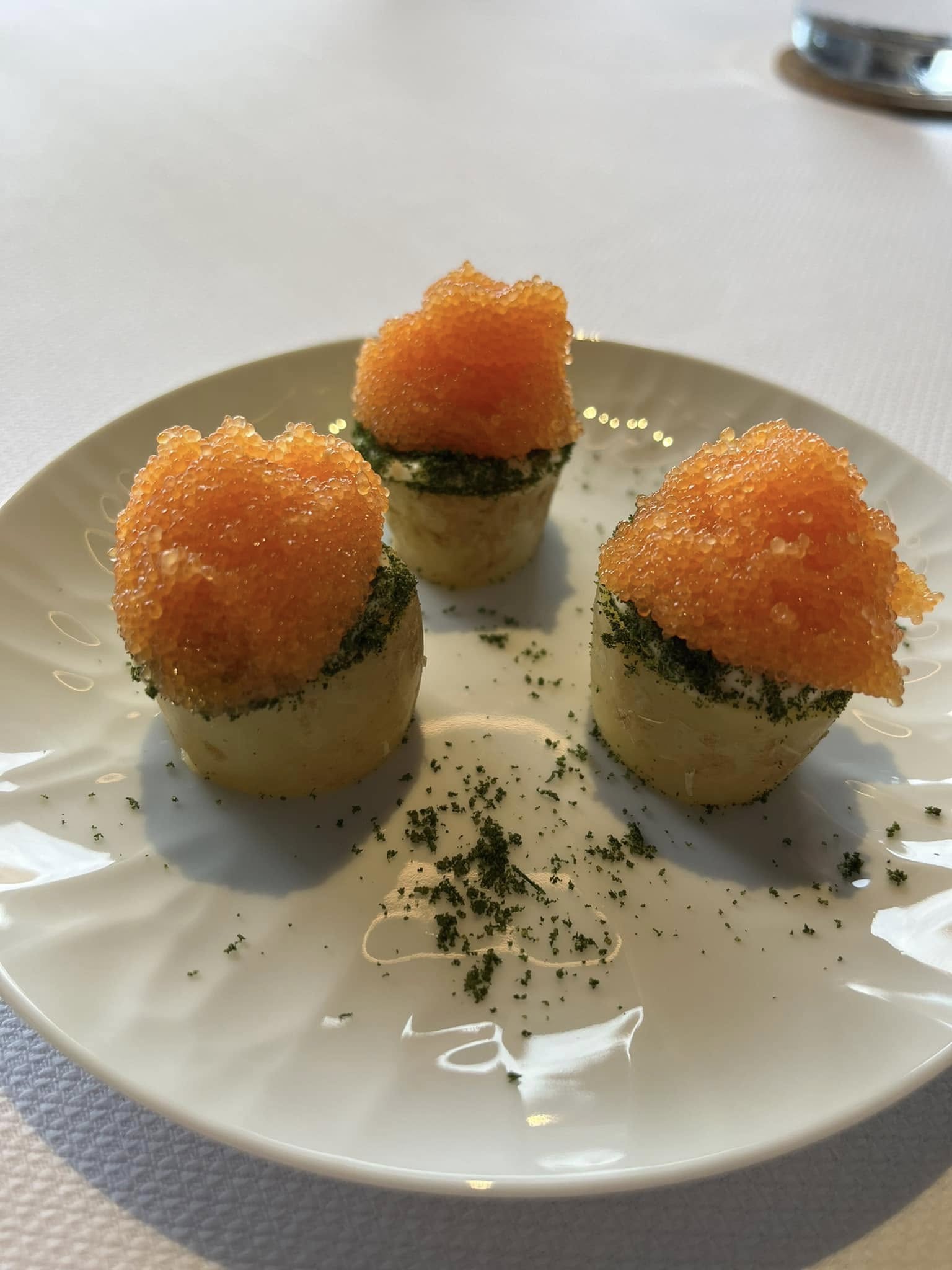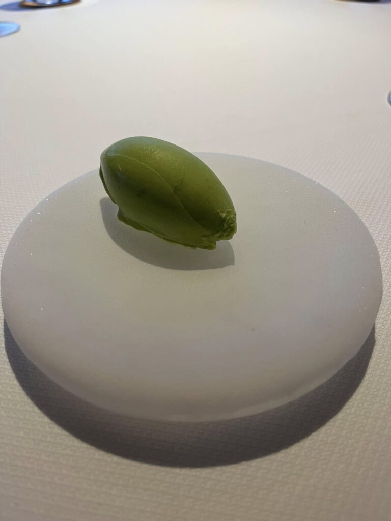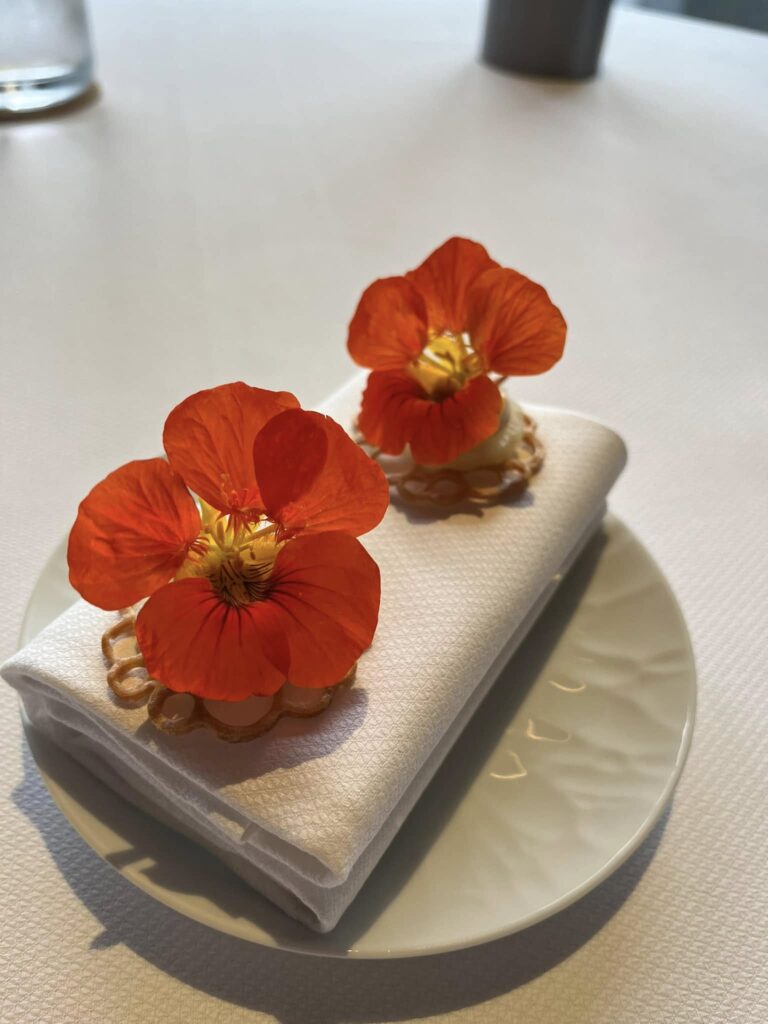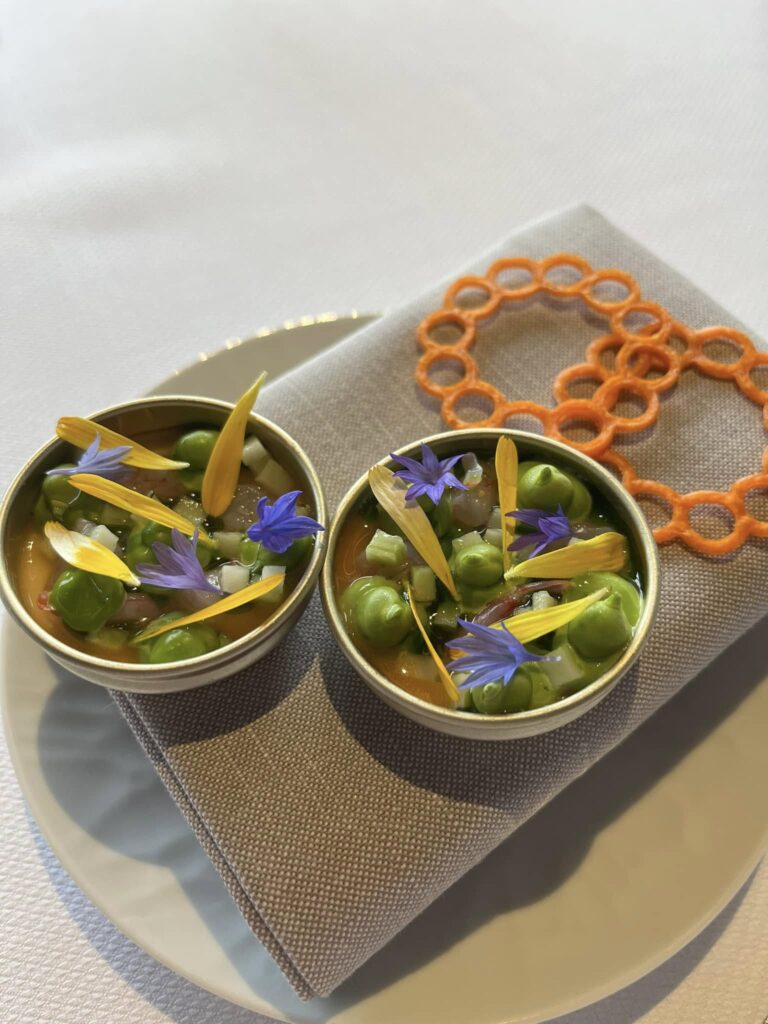 En fantastisk start. Alle 7 snacks var lavet til perfektion. Jeg synes billederne taler for sig selv, når jeg siger, at det var æstetisk smukke snacks. Efter hver snack tænkte jeg “det er den bedste”. Jeg nåede derfor frem til den erkendelse, at alle snacks var min favorit. I glasset havde vi: N.V. Cuvée Louis Victor, Coutelas, Champagne, Frankrig. Et dejligt glas bobler, der harmonerede godt til alle de små snacks.