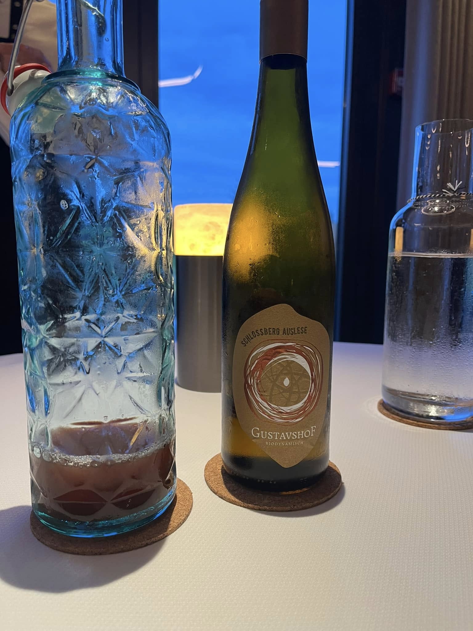 I glasset havde vi: 2022 Huxelrebe-Johanniter Auslese ”Schlossberg”, Weingut Gustavhof, Rheinhessen, Tyskland�Saft på jordbær, rabarber, vanilje og sødskærm.