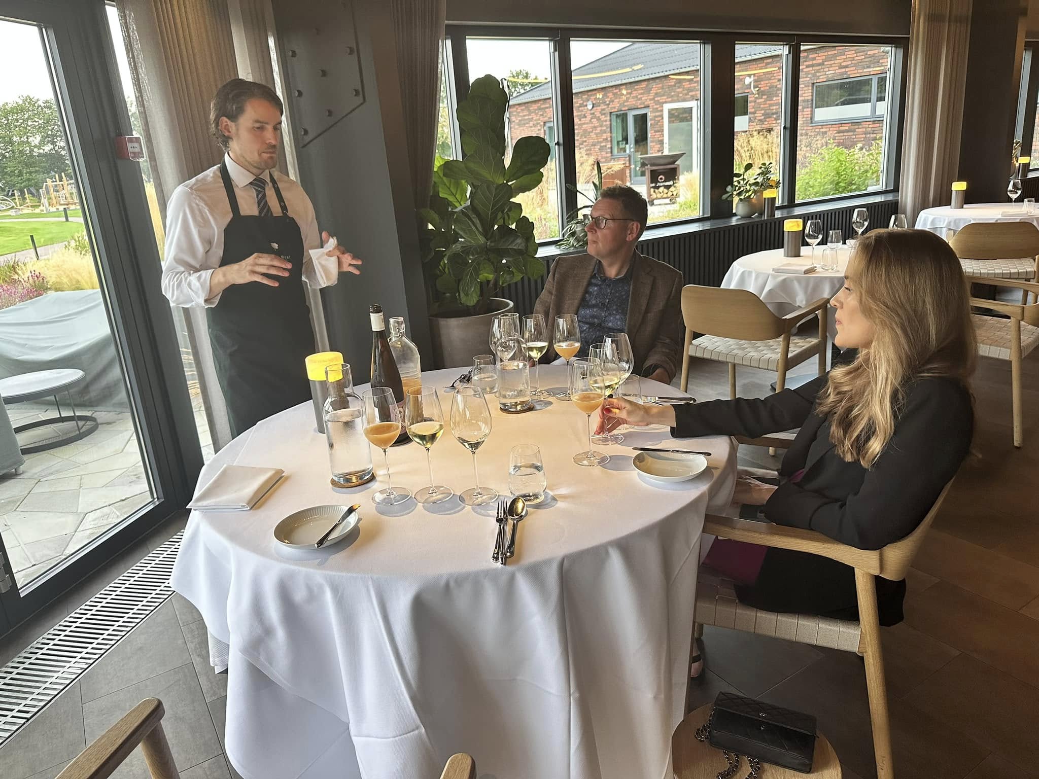 7 x snacks, 3 retter, blandet kørevenlig smagemenu på vine og saft: lige knap 1400 kr.