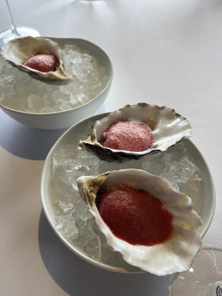 Indvasiv Gigas østers med blodribs olie og fermenteret brombær.
