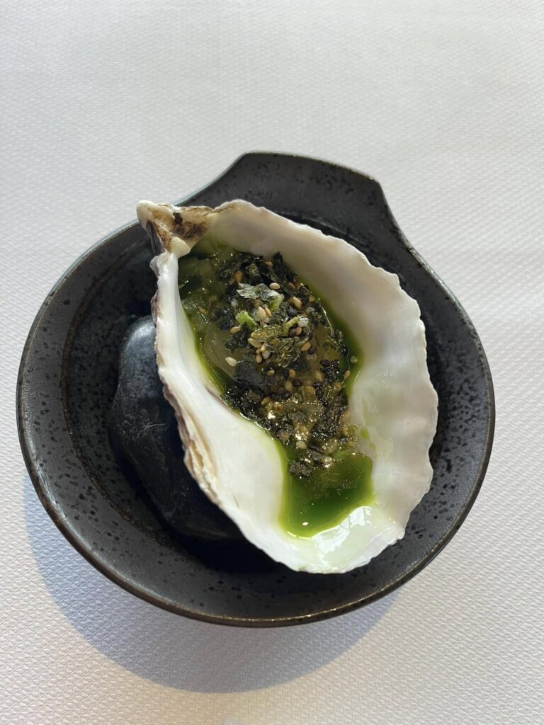 Falsk østers, geleteret blegselleri, agurk vakummeret i hyldeblomst og yuzu, tørret nori tang, wasabi og sesam.