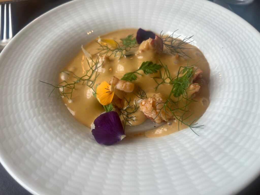 Første ret var denne aften Smørstegt Sorthummer med bagte løg, syltede hvide asparges, urter og en fantastisk hummersauce. En ret, der både var kraftig, klassisk og på samme tid havde dejlige sommerelementer, som gjorde det samlede udtryk let.