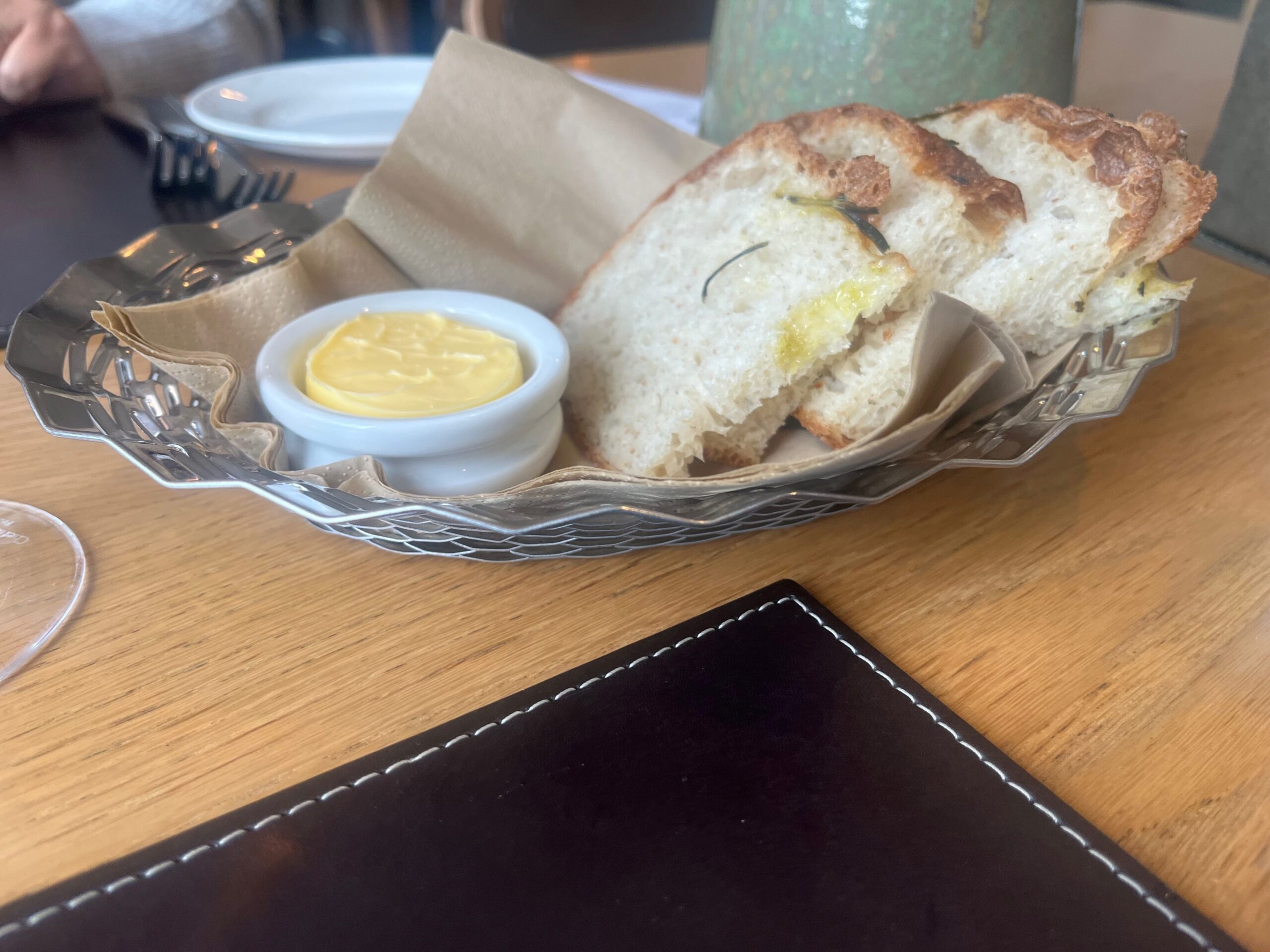 Vores menu begynder med et glas italiensk Prosecco “Extra Dry” med Hotel Nors egen etikette. En god anledning til igen at kaste et blik ud over det fantastiske landskab, som istiden og senere hævninger af havbunden har formet. Fra vores plads ved vinduet var det denne aften muligt at overskue hele Jammerbugt indtil Rubjerg Knude og Lønstrup. Der var ualmindelig god tid til at nyde udsigten, før vi fik lejlighed til at bestille drikkevarer – noget som trækker noget ned i den samlede bedømmelse af restauranten.