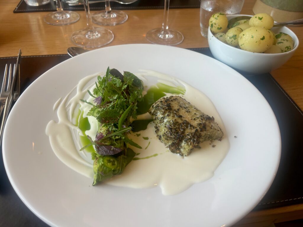 Havkatten var krydret med blandingskrydderiet Za`atar, der har sin oprindelse i Mellemøsten. Ved siden af lå en kåldolme, der var meget langt fra mormorkøkkenets kåldolmer med hvidkål. Her var der tale om fin sommerspidskål fyldt med dejlige urter, saltet agurk og chili. Hertil perfekte nye kartofler og en yoghurt-sauce, der fuldendte det mellemøstlige touch.