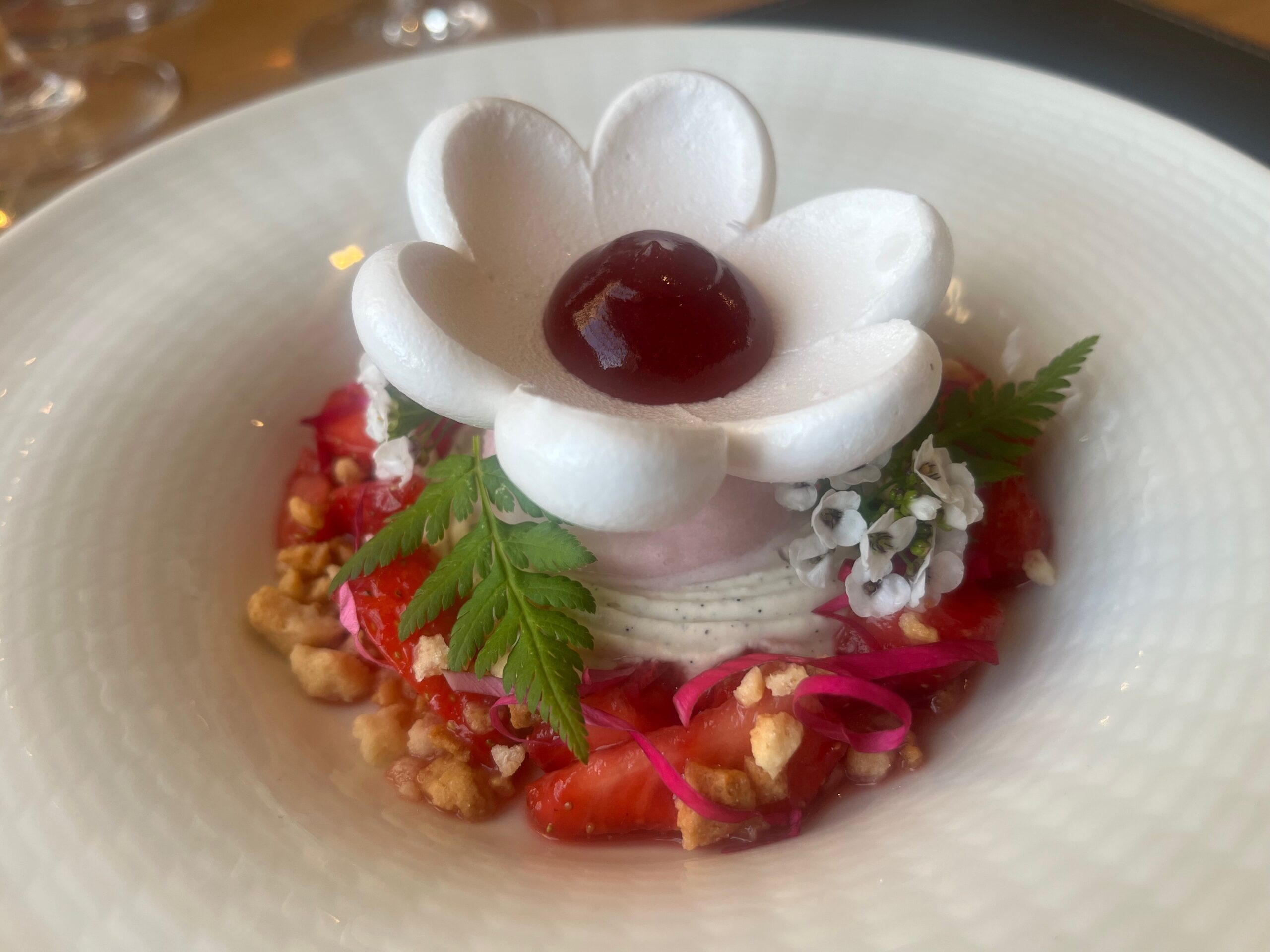Desserten denne aften var en rigtig sommerkreation. Flot så den ud! Jordbær-fileterne var suppleret af en dejlig rabarbersorbet, en let vanillecreme og strimler af blade fra hybenrose. En sprød marengs-“blomst” pyntede retten af sammen med små klaser af blomsten Biblomme og crunch af bagt marcipan. En himmerigsmundfuld.