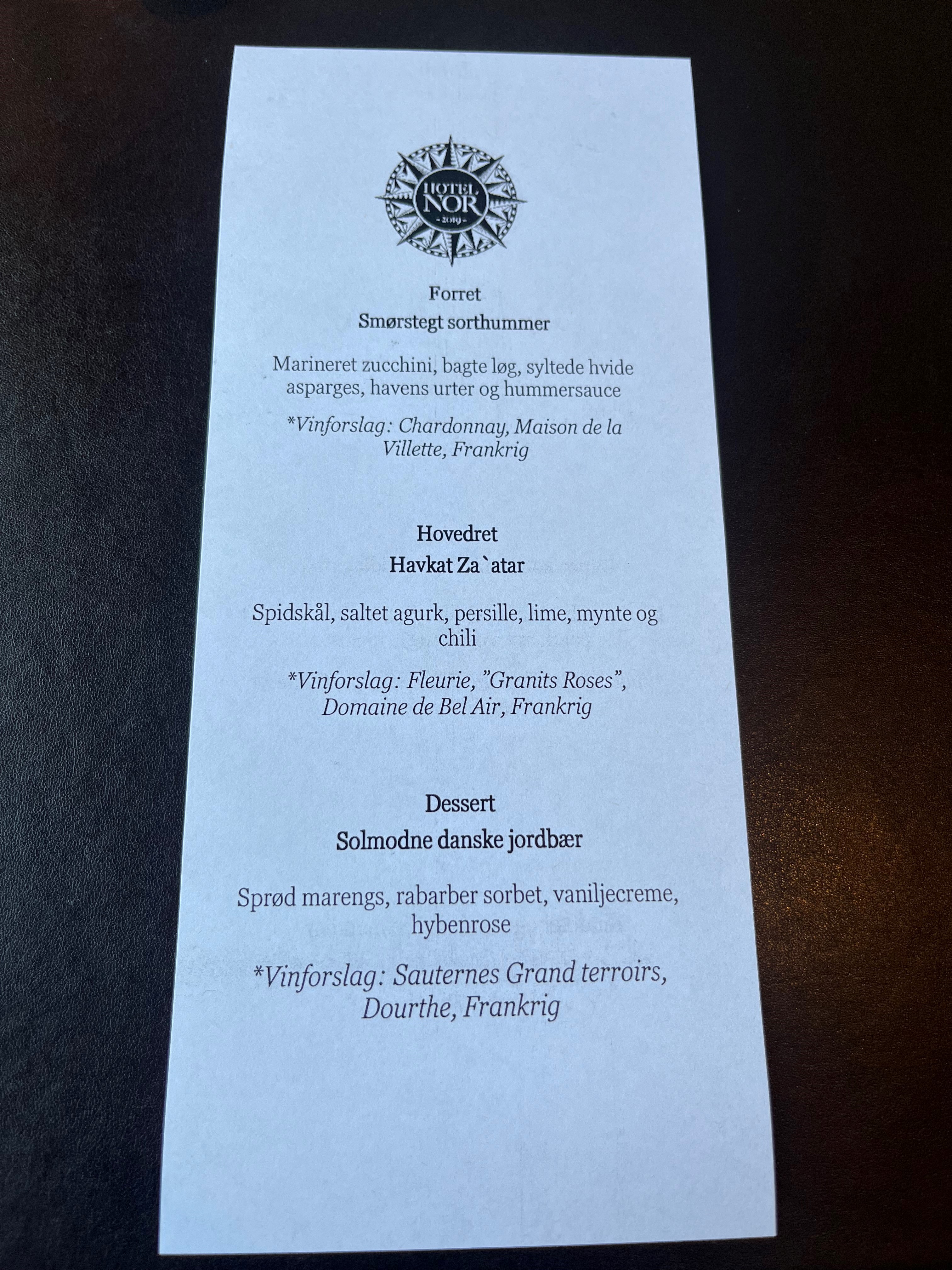 By Ott Rosé Selection 2023 Domaines Ott, Côtes de Provence (495 kr. Fl.). Det er også muligt at få en vinmenu til 350 kr. Roséen gjorde det dog glimrende til både den kraftige ret med sorthummer og den efterfølgende hovedret med havkat. Selve treretters menuen kostede 535 kr.