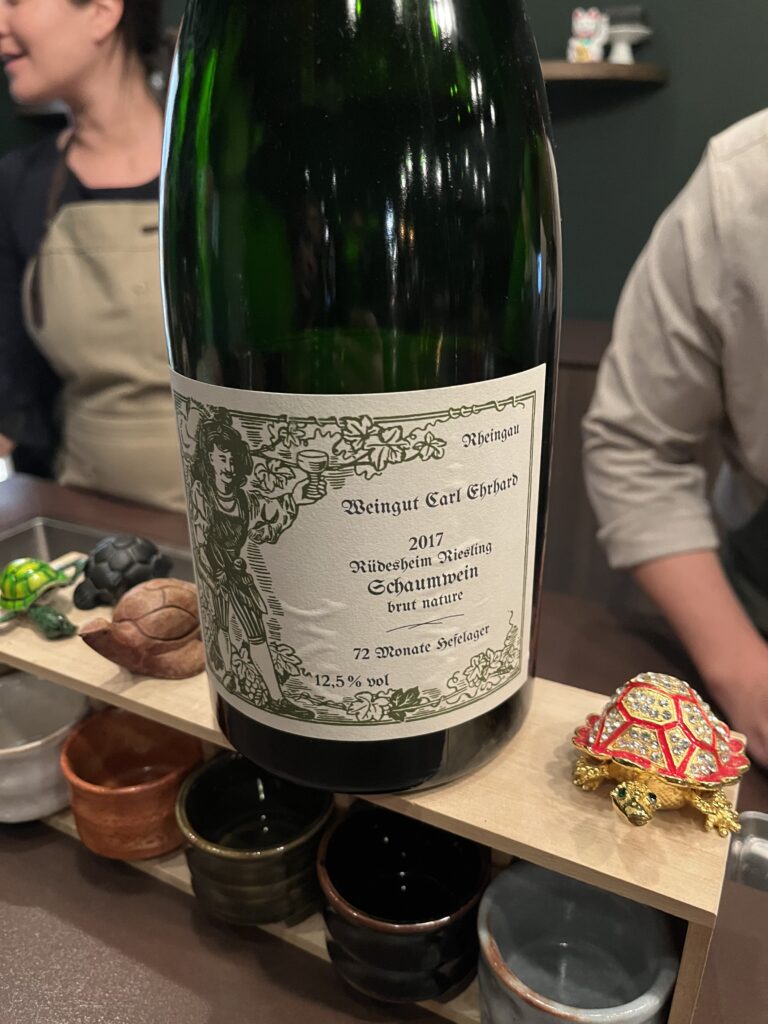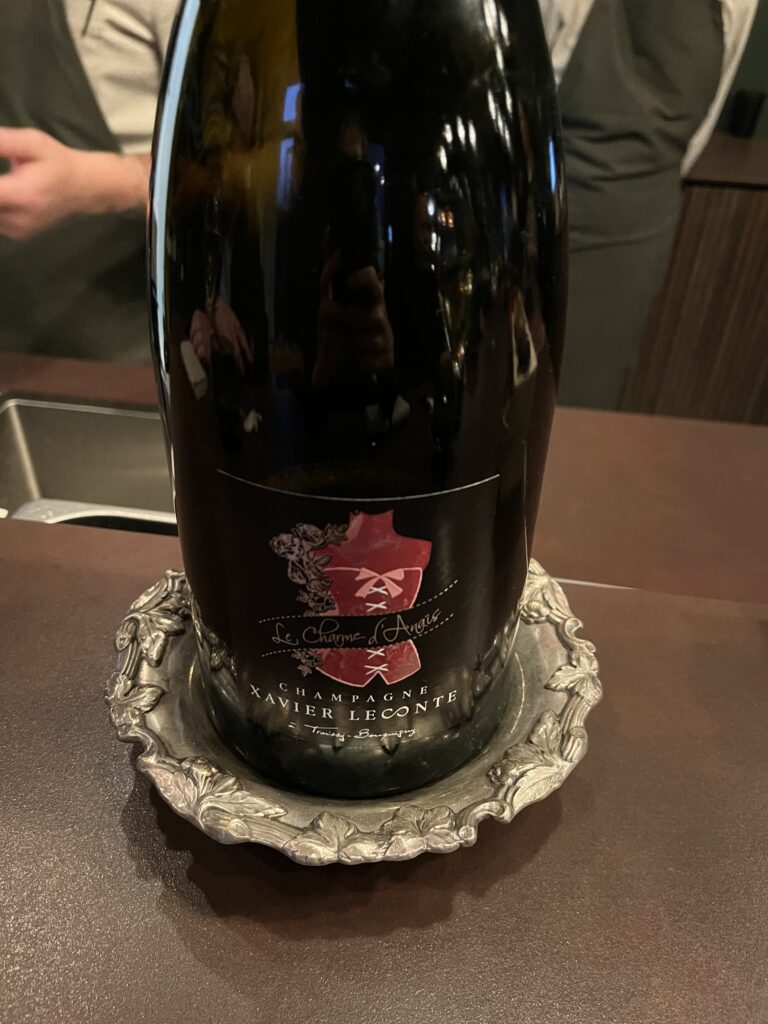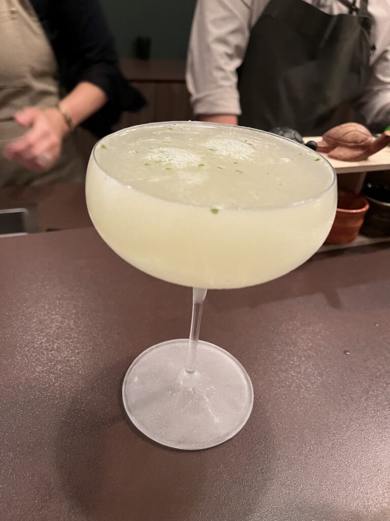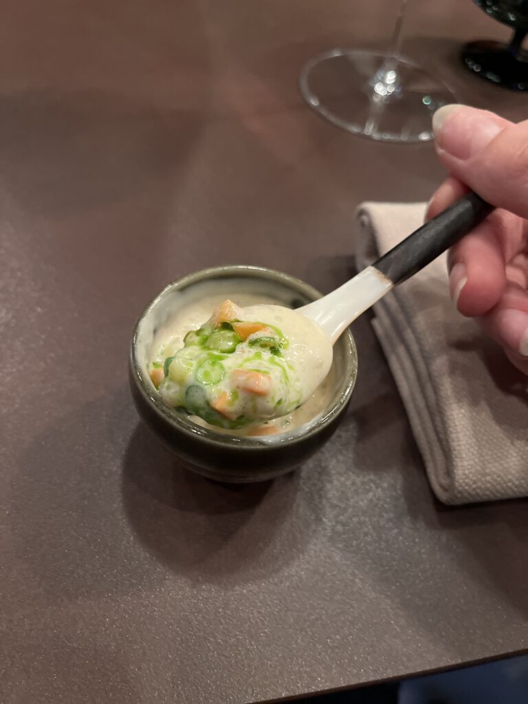 Vi fik lov at indtage seks ud af snackrækkens hele syv serveringer oppe ved den actionprægede spisebar, hvor der både kan sludres lidt med værtsparret og beundres “snacksernes” (hedder det det?) flotte sidste anretning under kyndige kokkehænder inden servering – meget omakase.