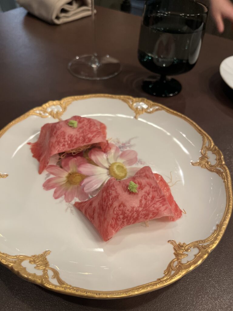 - Nigiri med rösti, jalapano-creme, under slices af den eksklusive wagyu a5-udskæring med den fine fedtmarmorering, samt – igen – antydninger af frisk wasabi