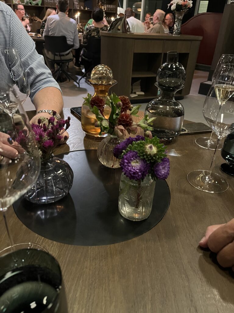 Og vi fortsatte med de øvrige delikate serveringer nede ved et dejligt bord med sit smagfulde blomsterarrangement. Tasting-menuens forret og hovedret var også blandt de bedste og mest elegante, vi har smagt blandt mange fine serveringer rundt om på vores gode nordjyske restauranter siden foråret. Mums for en smuk helleflynder-servering med sin velafbalancerede tomat- og bønnesauce fx – og duen i sin efterårsforklædning… bare mere mums.