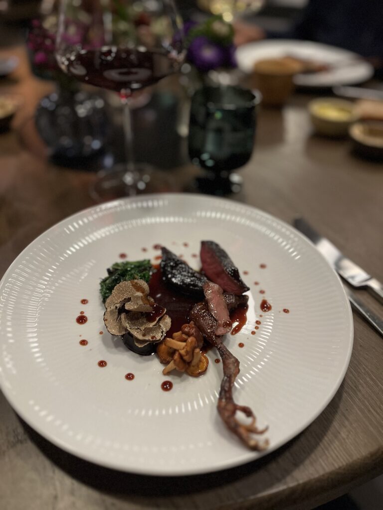 - Grillet fransk Imperial-duebryst og confiteret lår, bagte rødbeder, kantareller og kål med efterårstrøffel fra Piemonte og rødvinssauce med rødbede