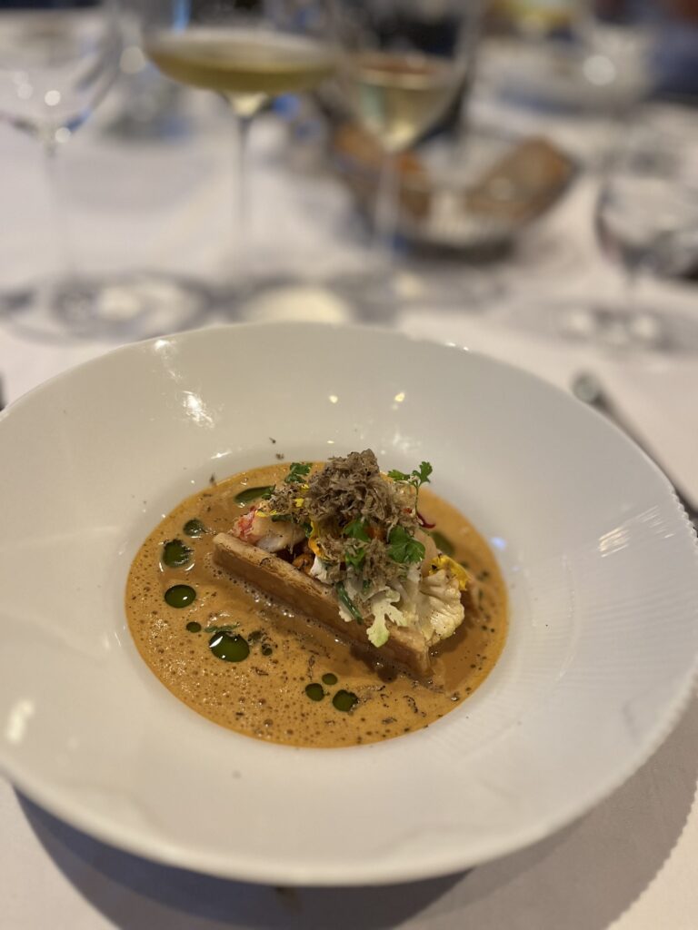 Anden servering: Tartelet med hummer, blomkålsbuketter, kantareller, cremet-tomatiseret hummersauce med cognac, og sommer trøffel. Vin: 2022 Bourgogne cote d OR Michelot.