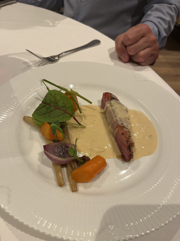 ”Hjem til Mormor” Brystfilet af sprængt/saltet pocheret and, glaseret med honning og timian. Serveret med sommergulerødder fra haven, Rabarberpure, flødepeberrodssauce samt nye kartofler fra Vildmosen. Vin: 2014 Barbera D Asti Monte Colombo Marchesi De Gresy