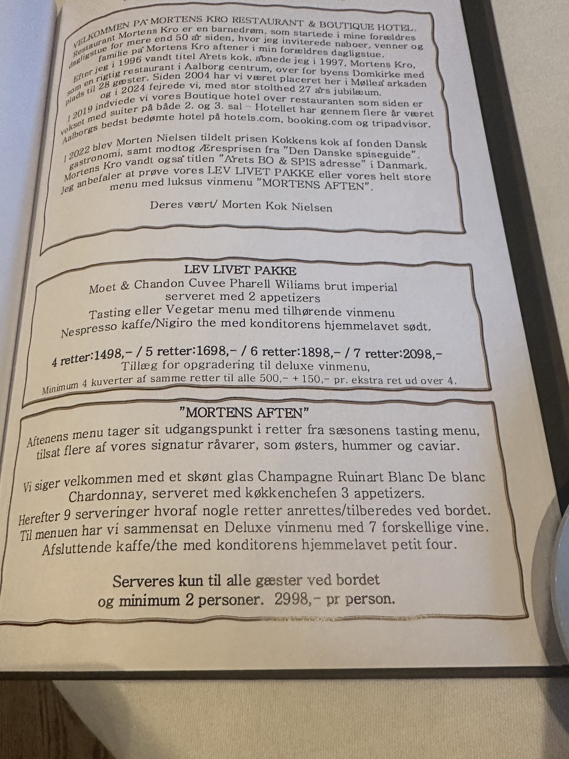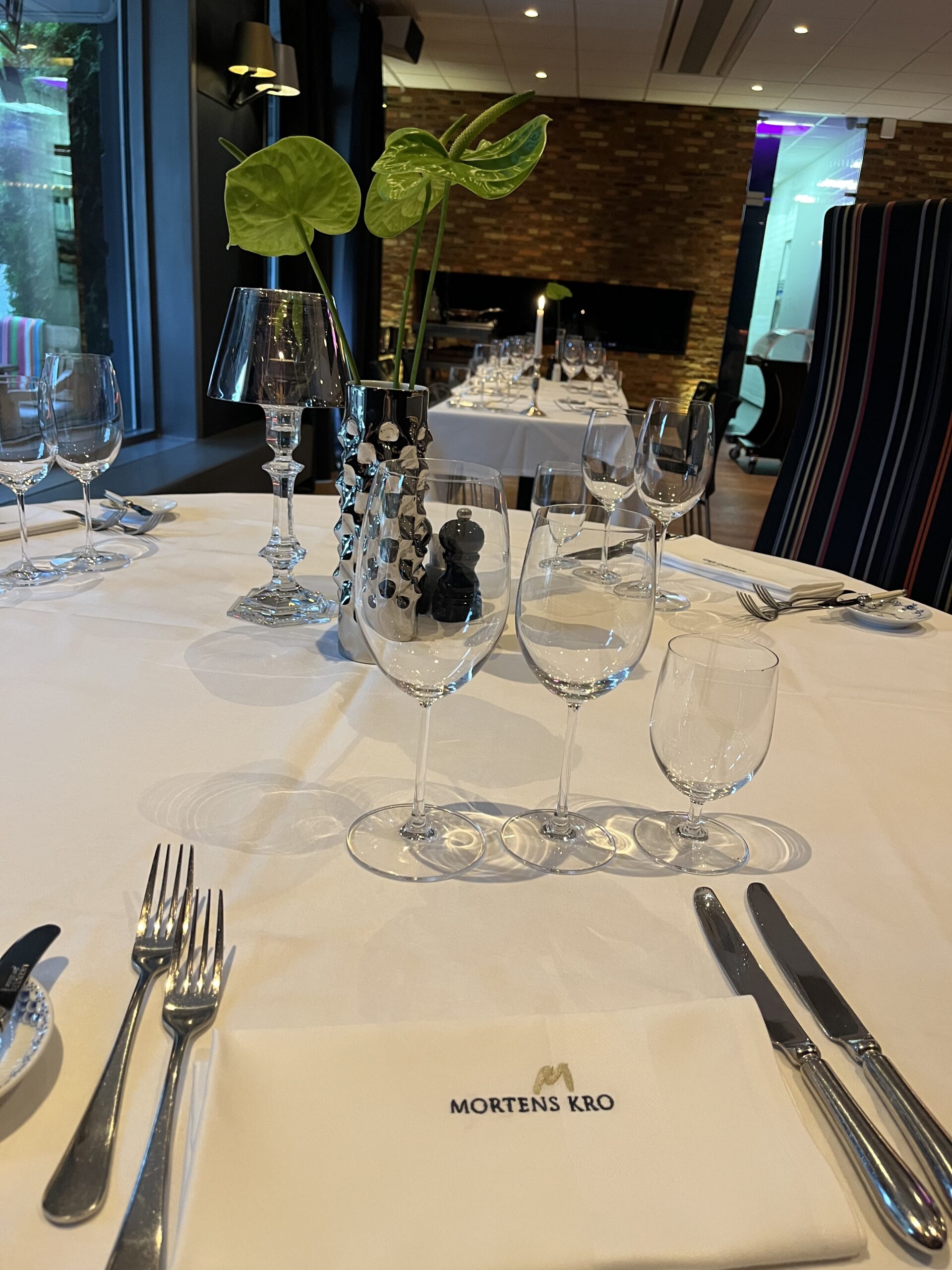 Der var stor begejstring ved vores bord. På Mortens Kro får man ikke kun dejlig mad i imponerende arrangementer. Man får også virkelig gode vine, som er sat godt sammen til alle retterne. Det skal de have ekstra ros for. Man får også en helt igennem fantastisk service. Morten leverer en god detaljeret beskrivelse af både mad og vine. Han formår også at fortælle små velovervejede historier, der giver et endnu større indryk af, hvad hans restaurant står for. Alt fra barndomsdrømmen om kroen, der bliver til virkelighed, og til hvor restauranten er i dag. Det var skønt at få klassisk gastronomi med stor smag, og det er en ting som Morten har holdt fast i siden han startede. Det satte vi alle ved bordet stor pris på.
