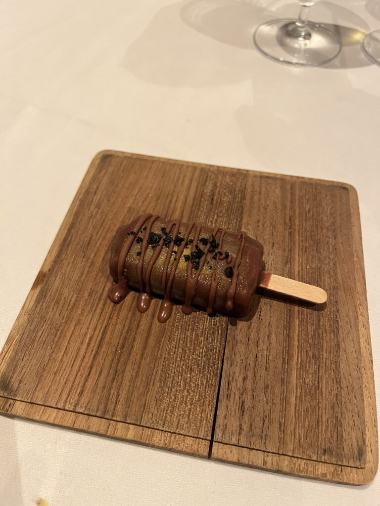 Først: Minimagnum med iscreme af saltkaramel. Overtrukket med lys Valrhona-chokolade pyntet med sort salt og guld.
