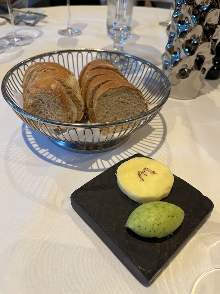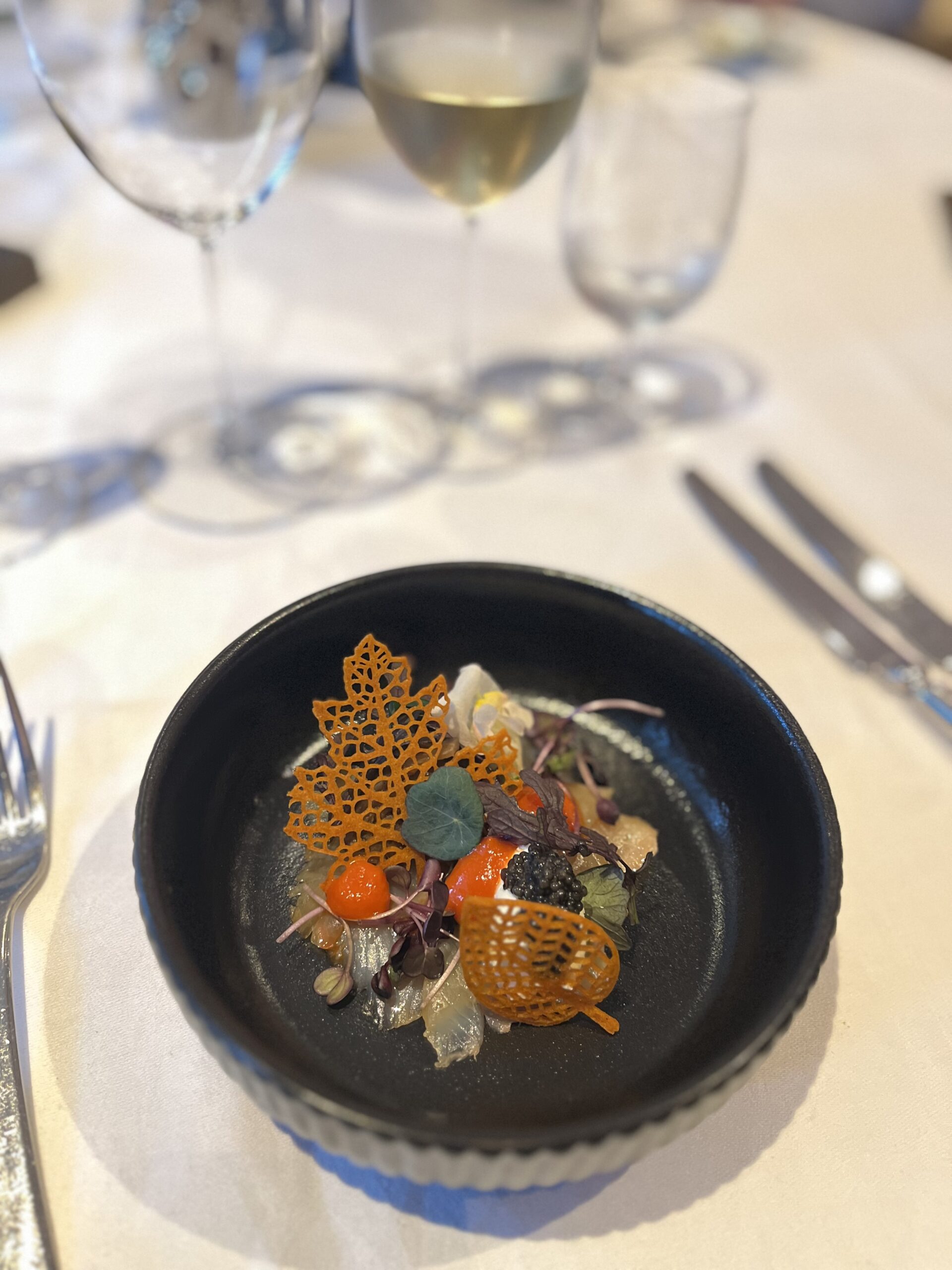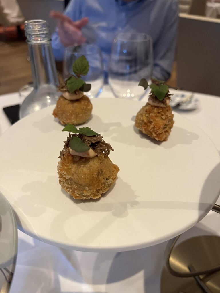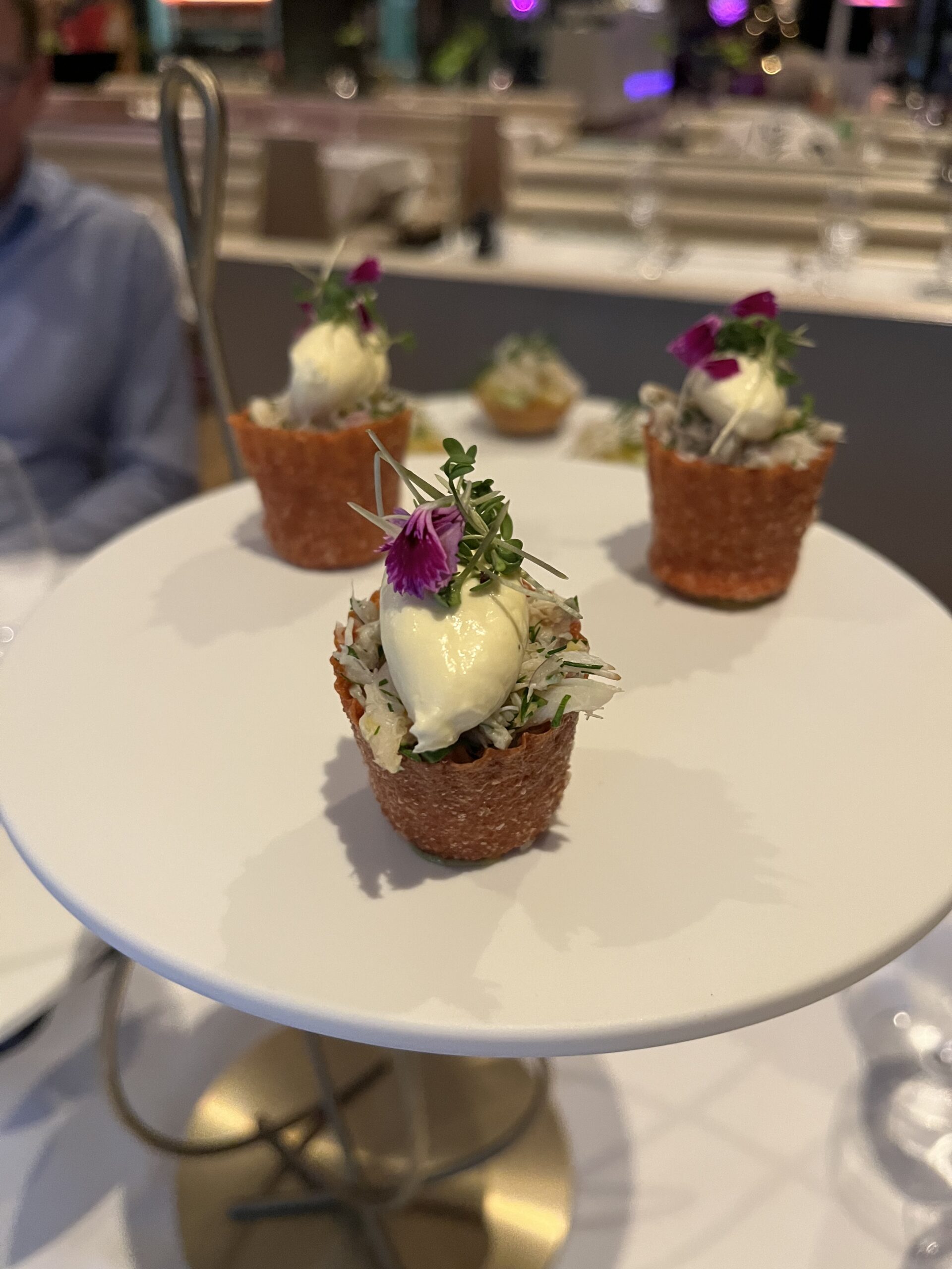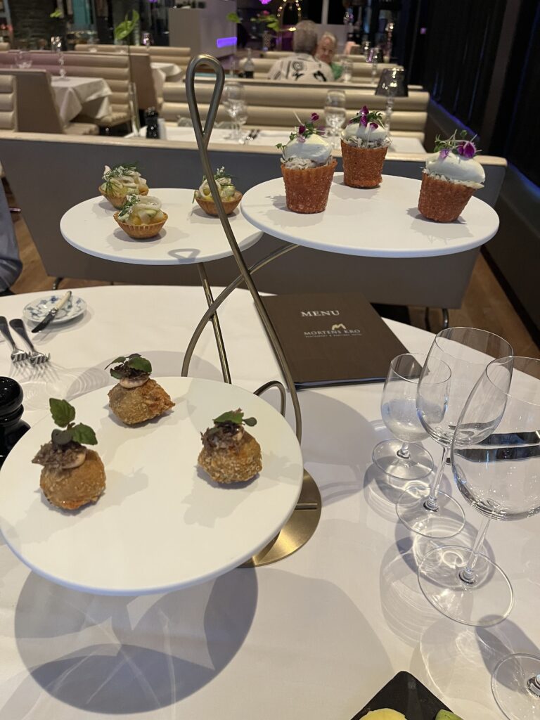 Vi må indledningsvist rose måden hvorpå disse snacks blev serveret. Flot servering i flere etager. Alle tre snacks bød på gode smage og flotte teknikker. Vi startede friskt og syrligt ud med de to snacks med skaldyr, hvorefter vi sluttede af med stor umami med svampe og god trøffelsmag. Skyllet ned med et dejligt glas bobler – vi kunne oven i købet vælge mellem to champagner – klassisk og rosé. Skøn start.