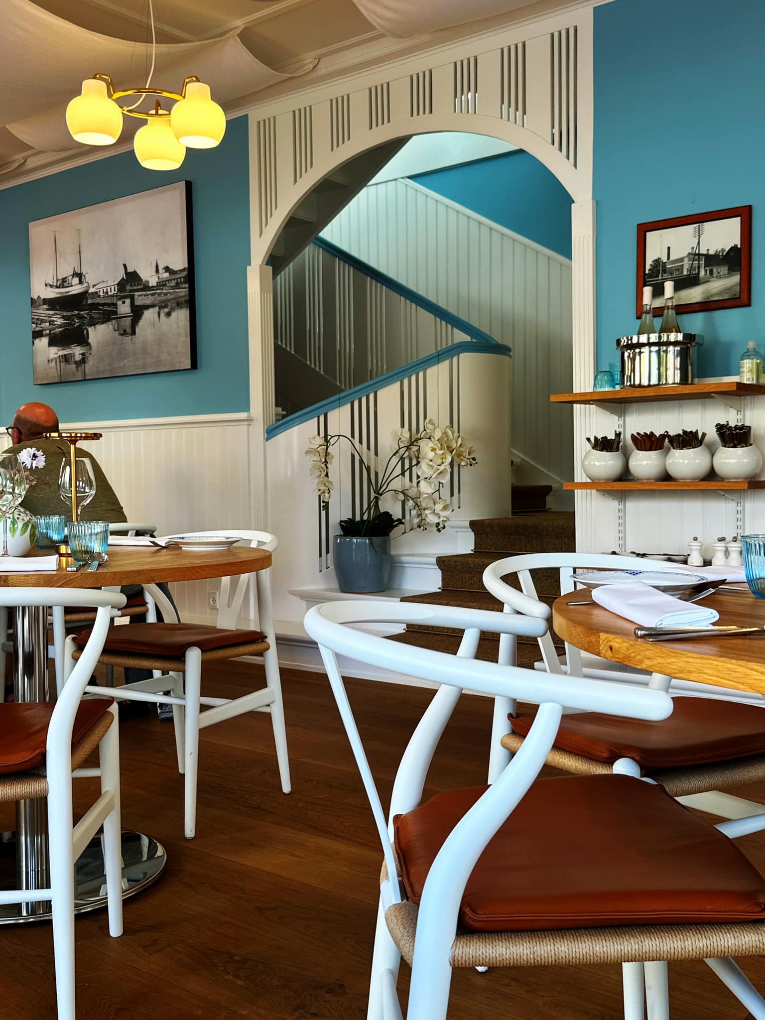Behageligt bænket på Wegners klassiske Y-stole (med læderpuder) nød vi på stedets kongelige porcelæn: