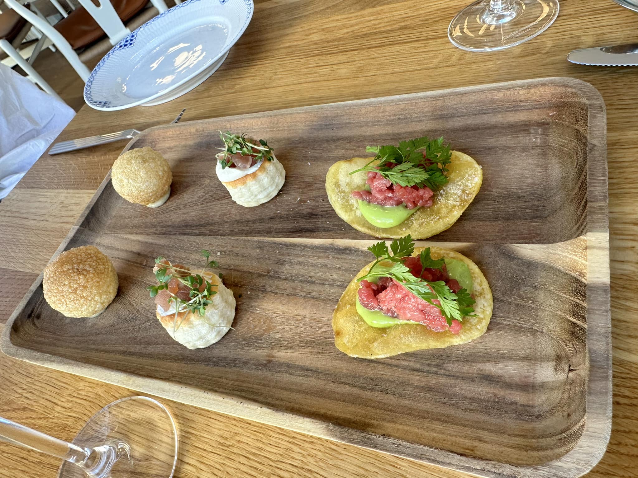 – Krogmodnet oksetatar på aspargeskartoffel chips med olivenolie og kørvel