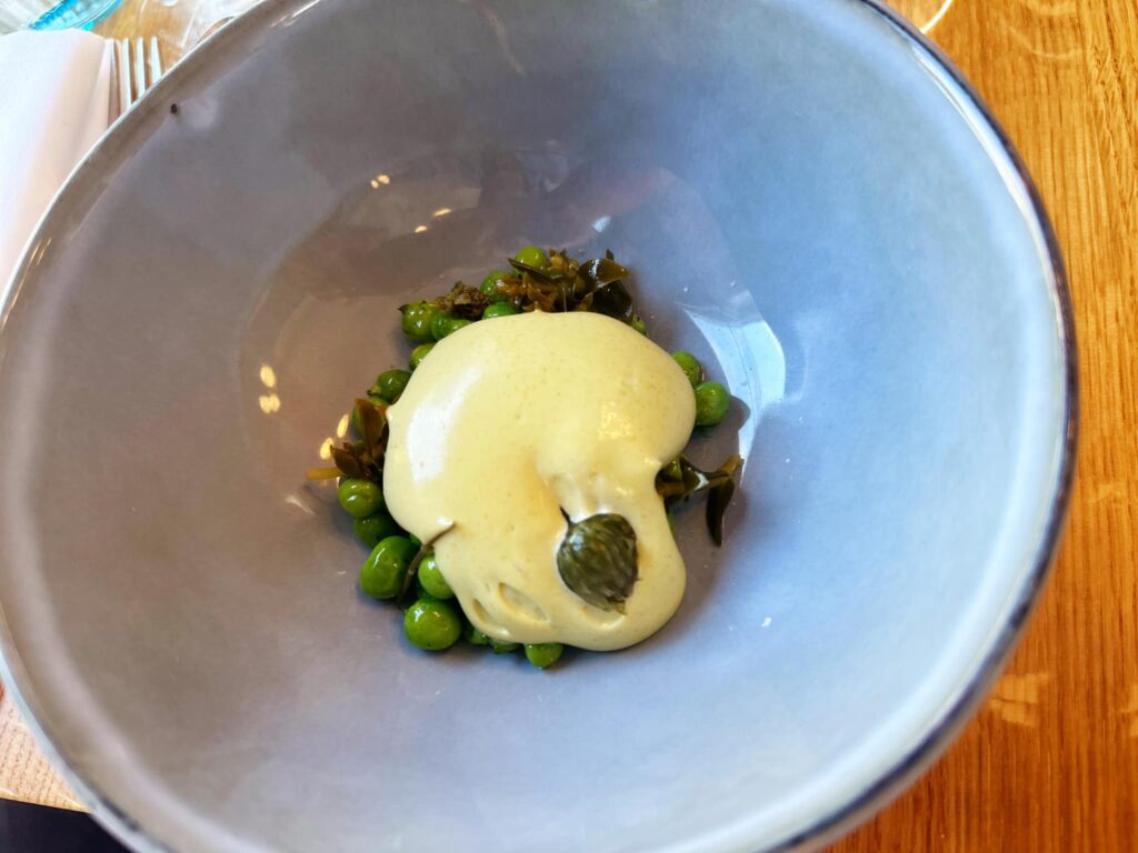 Nordjyske ærter, vilde urter fra Skagen, strandportolak, røllike og purløgsblomst samt gran-mayonnaise lavet på gran fra heden syd for Skagen. …Bare skønt når der serveres håndbælgede ærter tilføjet det lille svirp med de vist syltede strandurter sad serveringen lige i skabet.