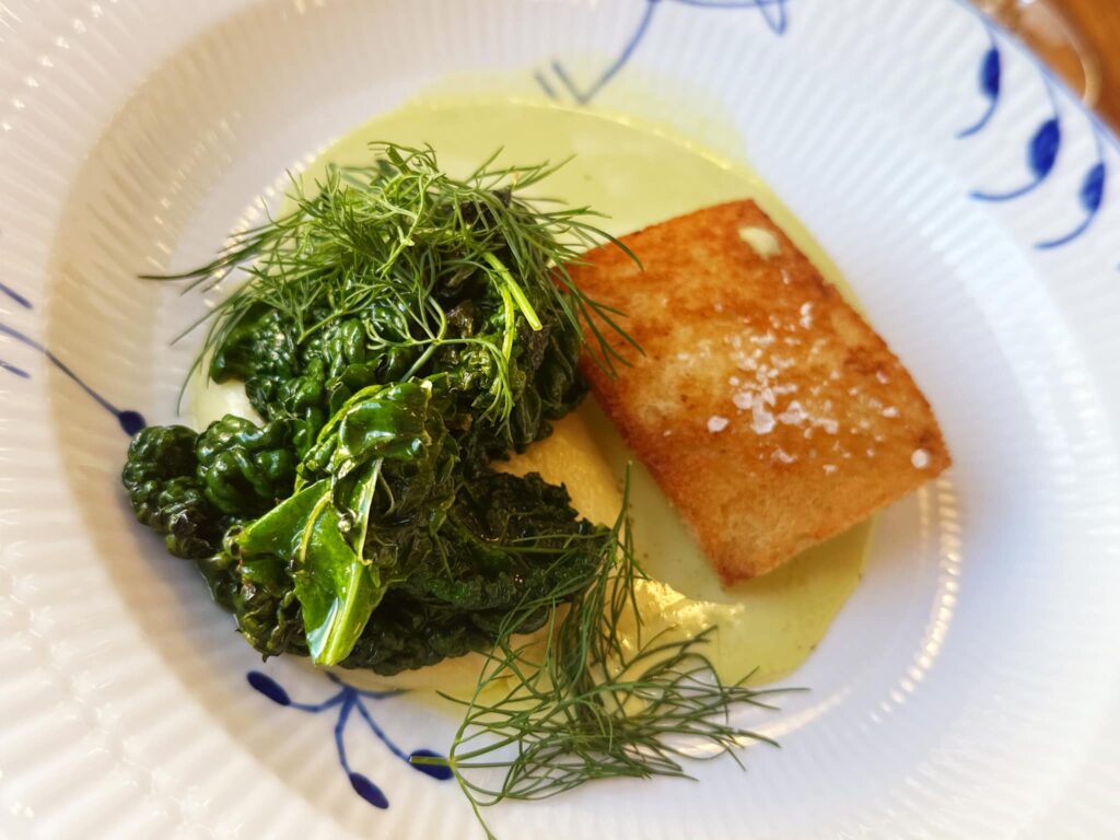 Vodfanget kuller med urtesouffle stegt på brød med sommerkål og ramsløgssauce. Enkelt og godt – sommerkålen var måske en anelse for saltet men dejlig sprød.