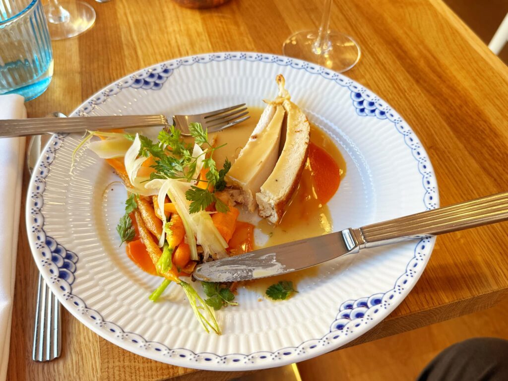Urtefarseret ungkyllingebryst med lokale grøntsager, små spæde karotter, gulerodspure og crudités af blegselleri, syltet agurk og gulerod samt saltetristede nødder og sauce supreme. …Saftigt – smagen af dansk sommer og klassisk badehotel.