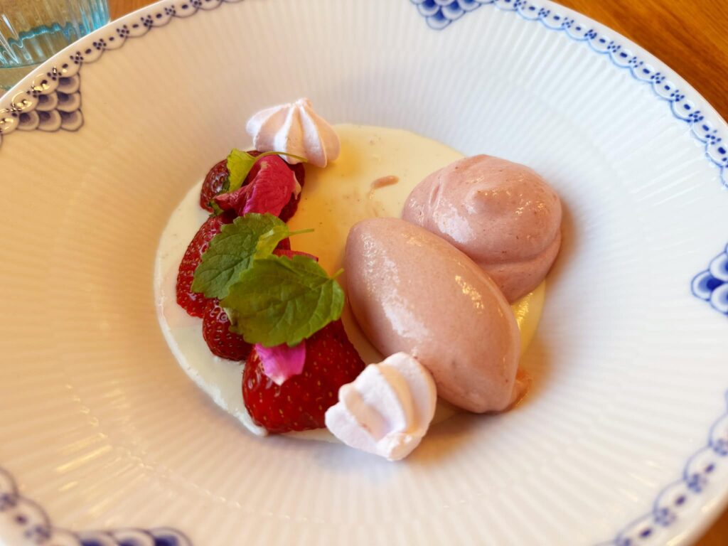 Danske jordbær fra Sæby med koldskålsfromage, hjemmelavet kys, rabarber crudites, jordbærskum og syltede samt friske hybenrosenblade.