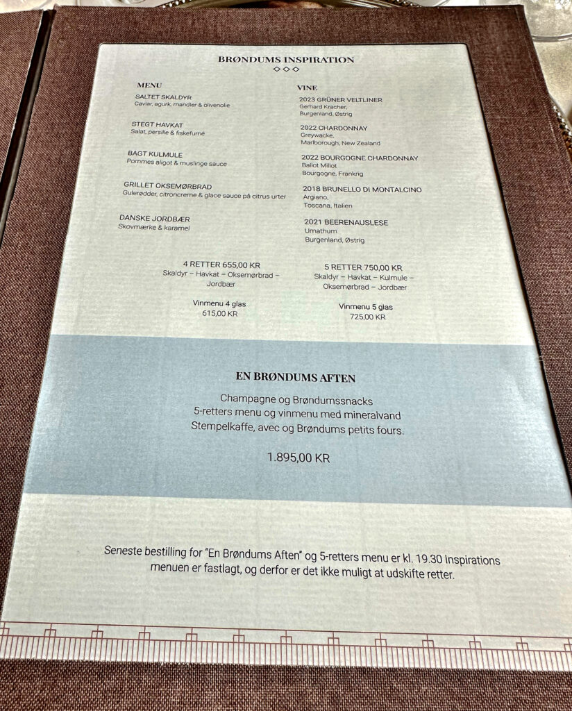 Det er jo i øvrigt netop meddelt, at den meget anerkendte hotelkæde Arp-Hansen Group fra nytår overtager ejerskabet og den fremtidig drift af Brøndums. Det kan jeg kun betragte som en kongeløsning for Brøndums, der ellers – siden den seneste indehaver Bendt Fredbergs død – har befundet sig i et ejermæssigt ingenmandsland. En længere forhandlingsperiode, hvor hoteldirektør Emil Hauge driftsmæssigt har holdt skruen snorlige i vandet under kyndig eksekvering af køkkenchef Mikkel Heuck og restaurantchef Jesper Kaasgaard. Sådan som vi tydeligt oplevede det på vores Brøndums-sommeraften.
