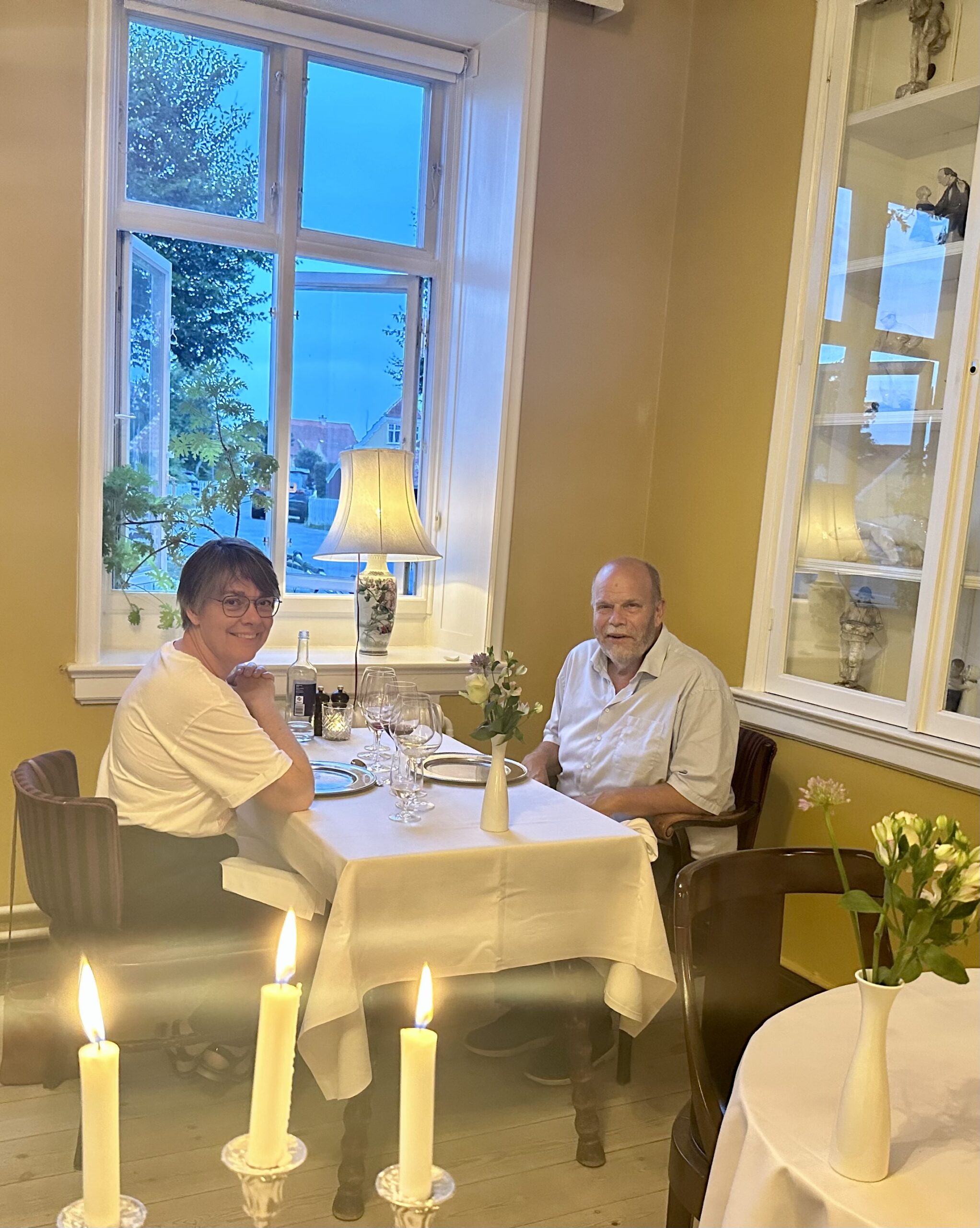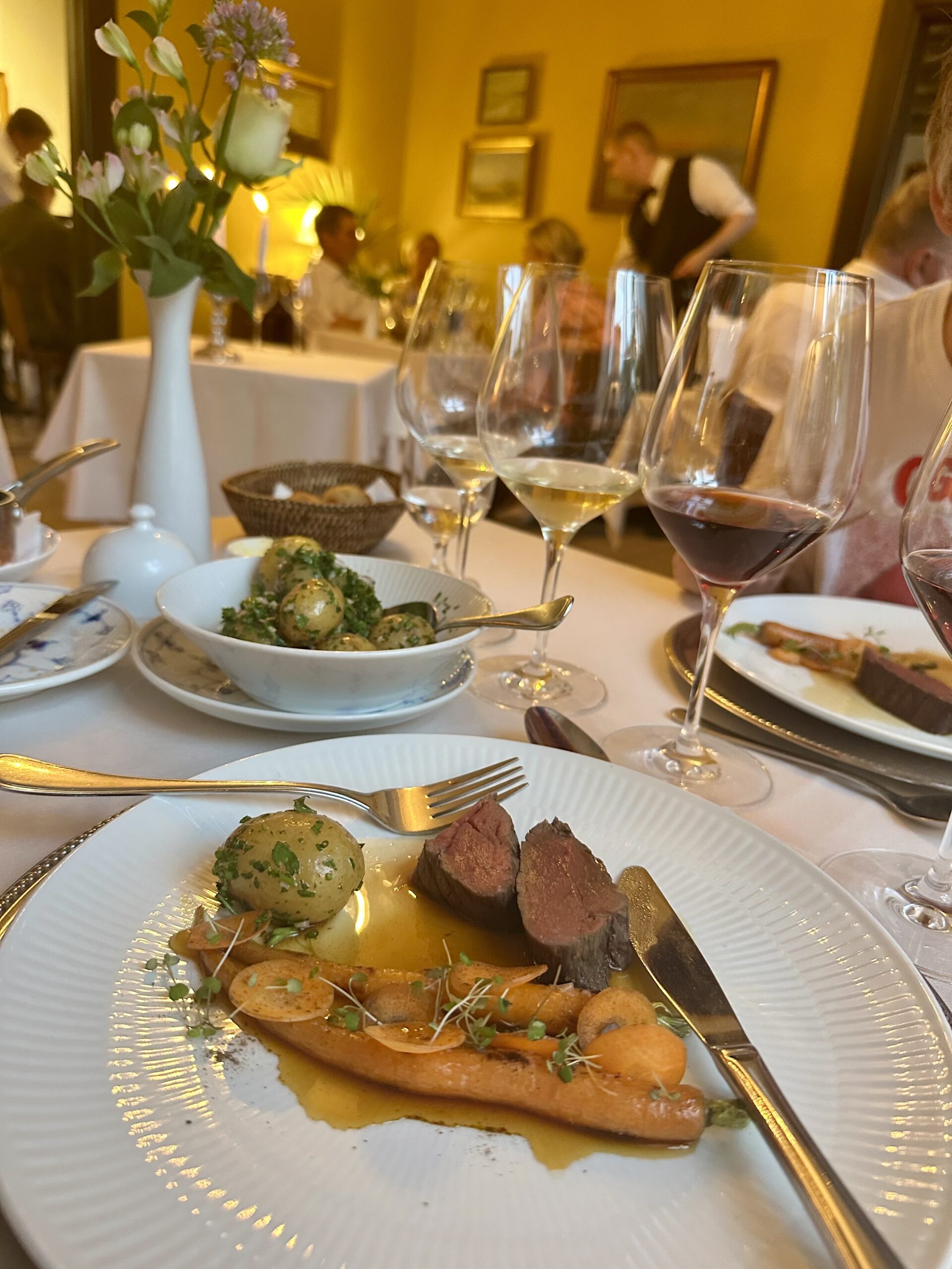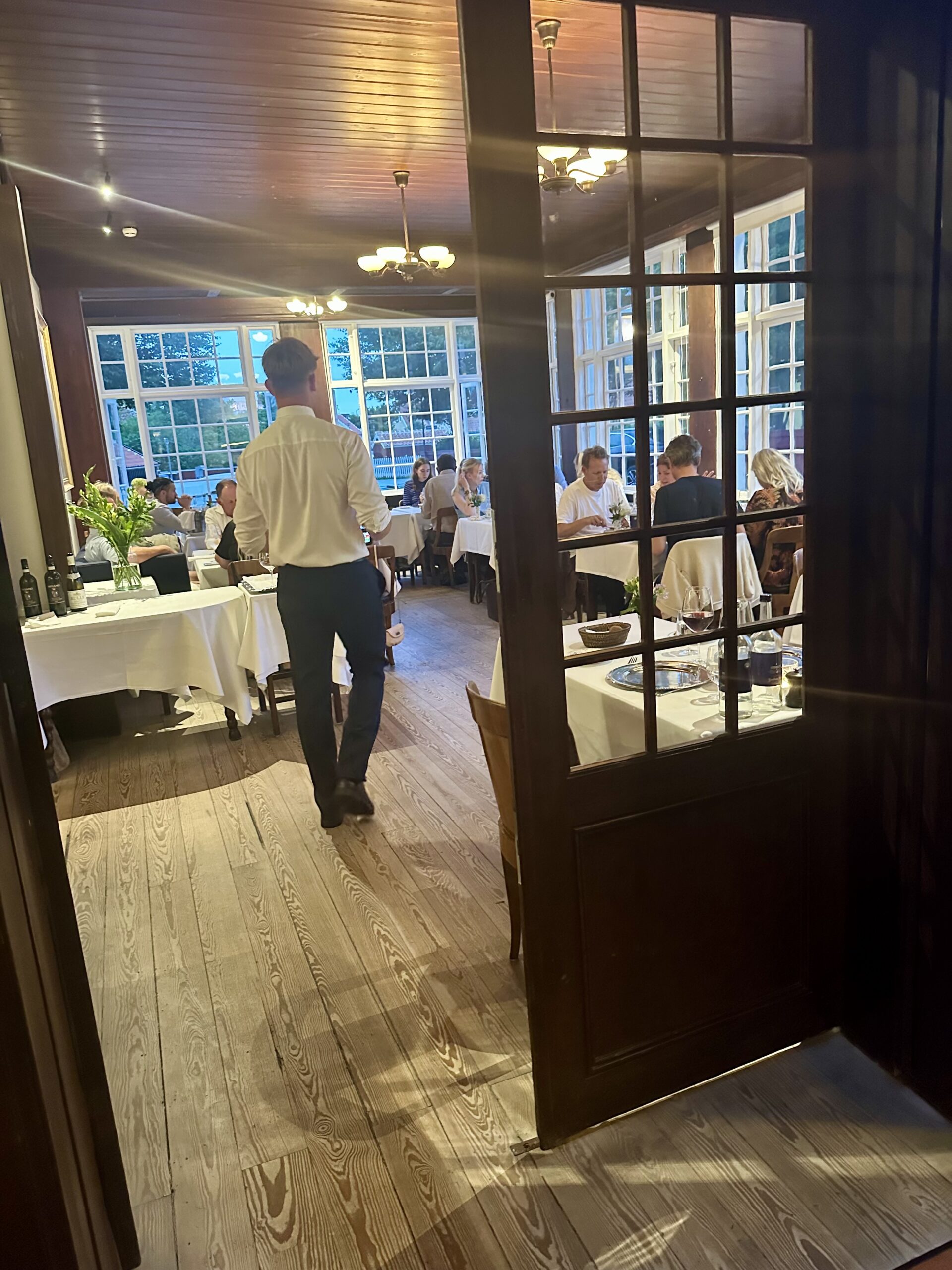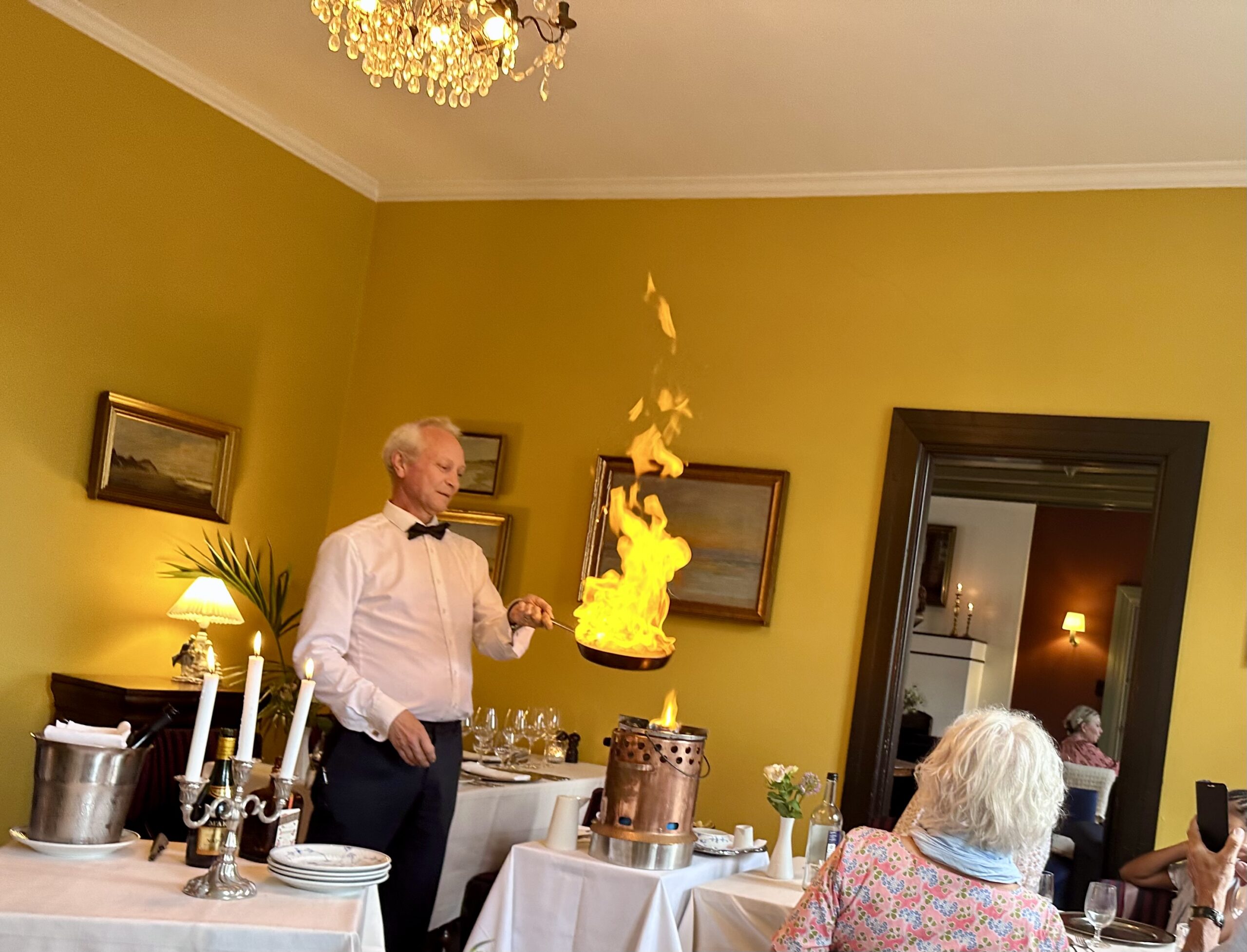 Vi havde – selvfølgelig efter at have booket et par måneder forud – fået bord i den gule spisestue med de mange fine originale Skagens-malerier, hvor det også var interessant at følge med i serveringerne ved de fire andre borde. Inklusive kyndig Crepes Suzette-flambering og anretning fra det fine a la carte-kort – til flere forventningsfulde og heldigvis ”velafrettede,” artige børn ved nabobordene. Altid et godt show.