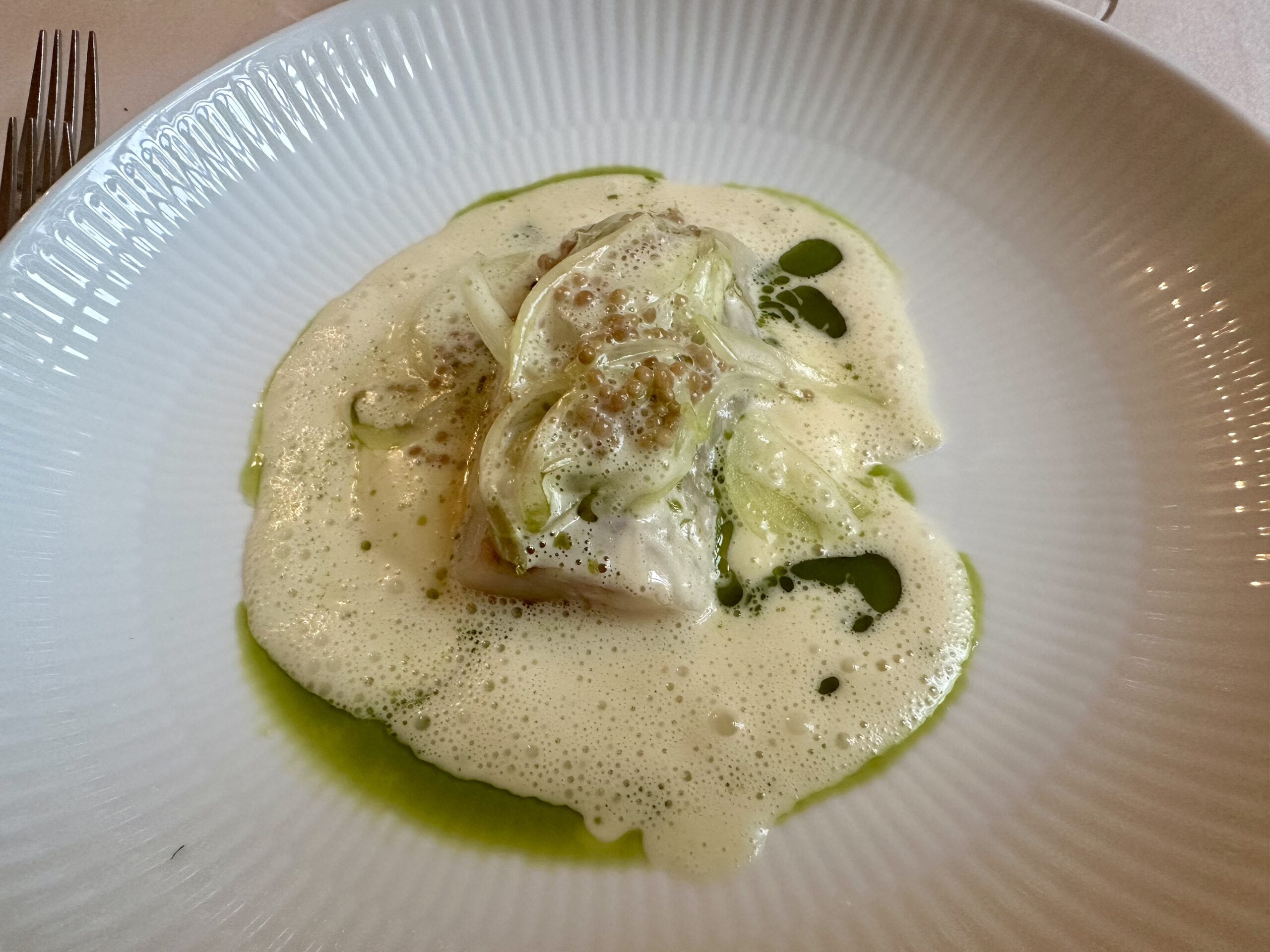 Der er altså noget ekstra kvalitet over at blive betjent af tjenere, der bare kan deres metier. Og i klassisk mundering med butterfly tilføjet deres små, lune bemærkninger og vidende svar på vores interesserede svar undervejs. Og herlighederne leveret på skarptstrøgede hvide duge, blanke sølvblanke dæktallerkner og ind i mellem også på husets musselmalede.