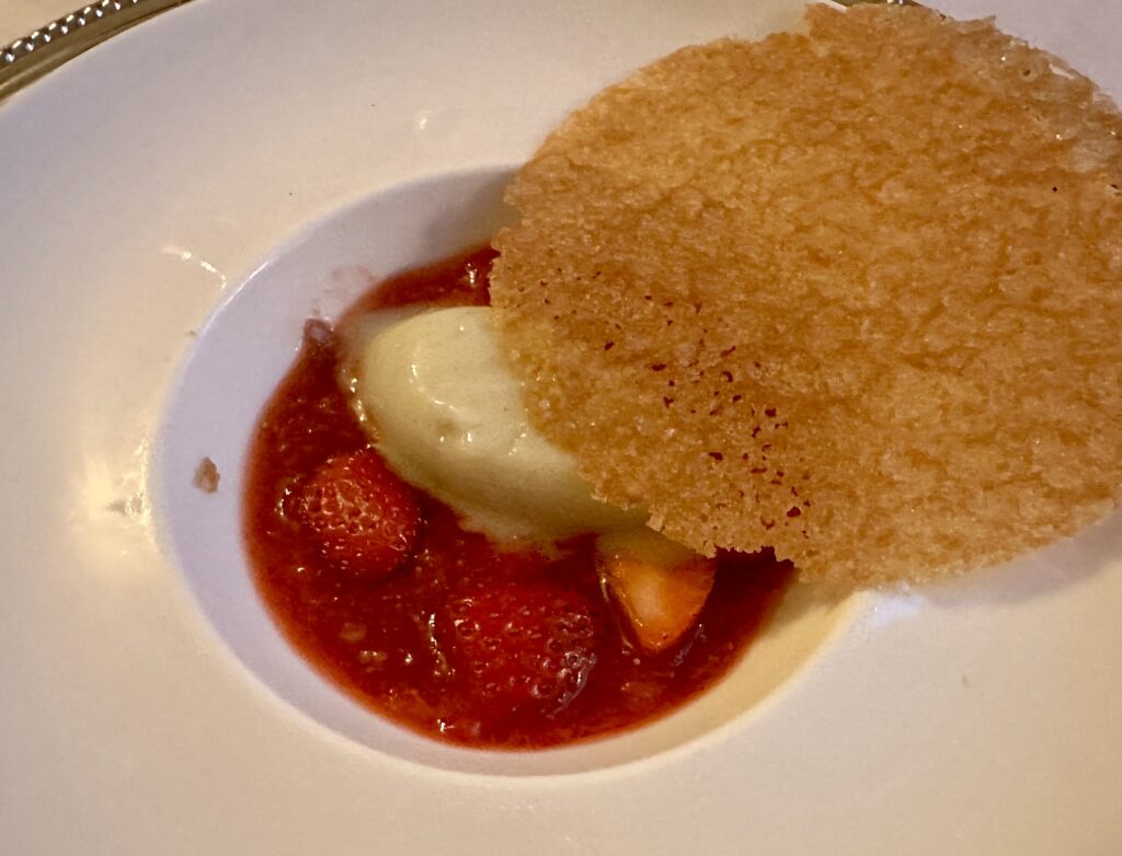 DANSKE JORDBÆR kørt delvis i grov grød i kødhakkeren med skovmærkesirup og siden tilføjet stykker af friske jordbær og en sorbet på friske jordbær. Det hele anrettet under et let låg af knasende karamel-tvil.