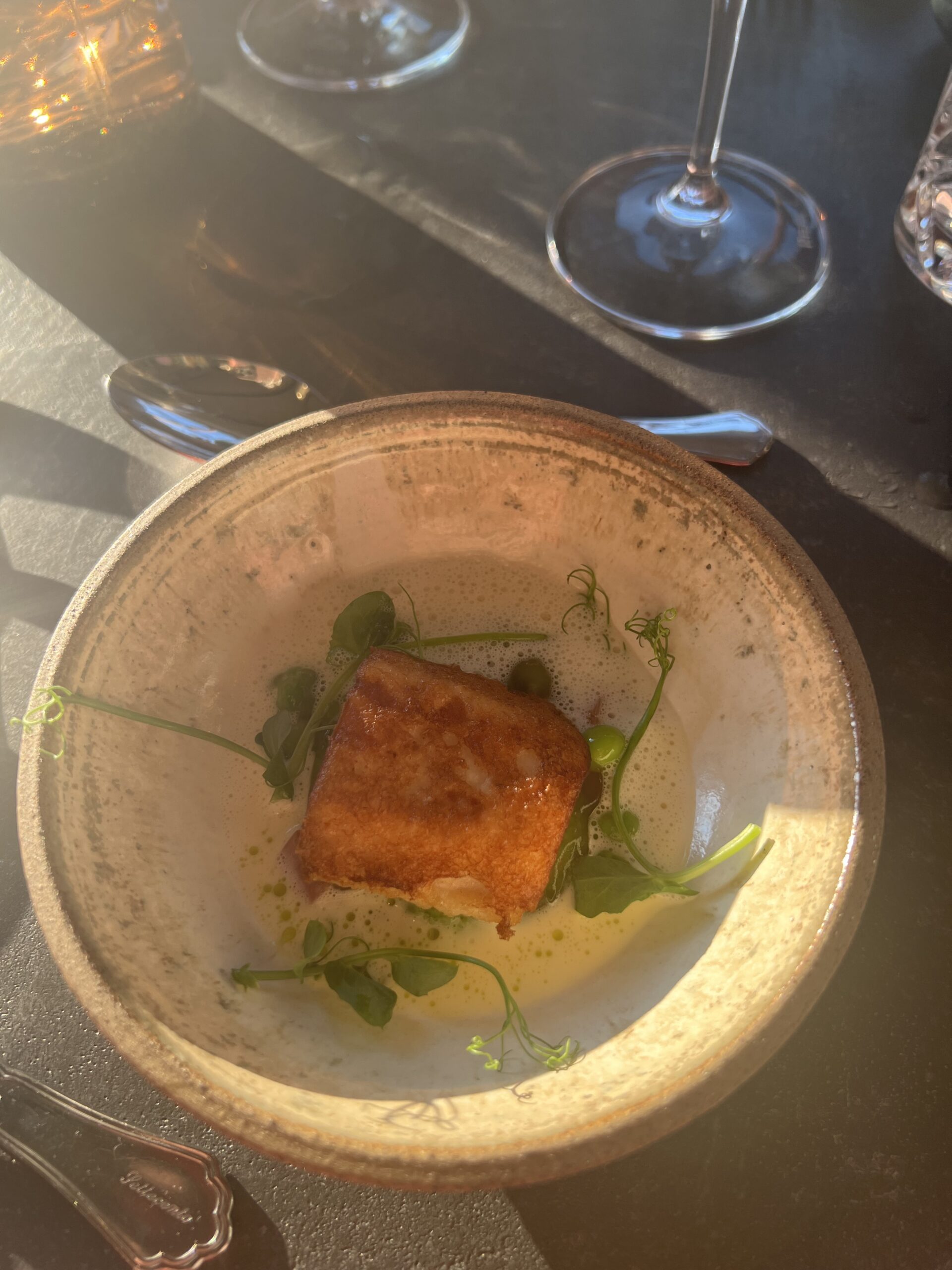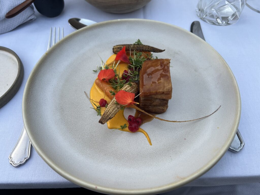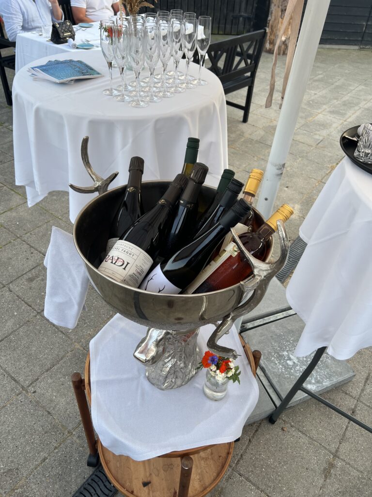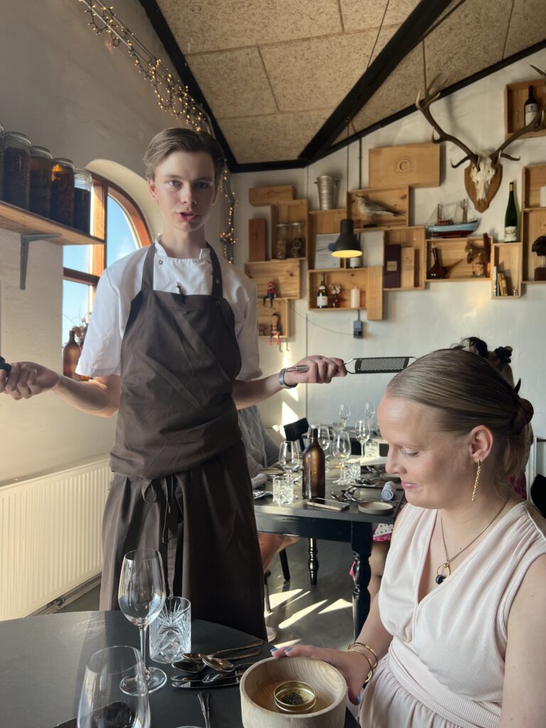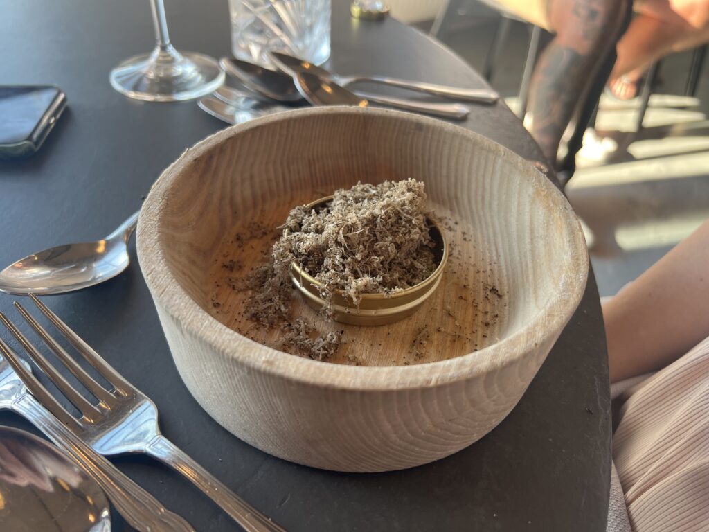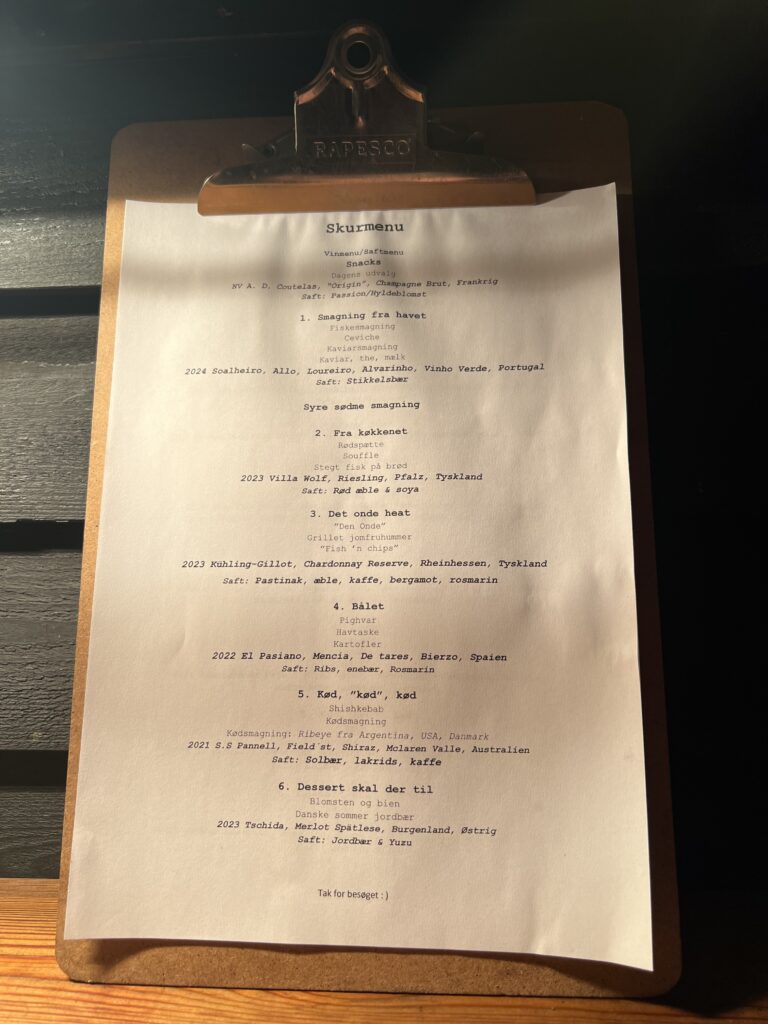 Ud over velkomstcocktail, bestemte vi os også for at tilføje med en “Den onde”-servering, Simons ”Velfærdslasagne” med et nederste lag – anrettet i en lille kaviardåse – af sorthummerklo med selleri og trøfler og oven på et lag med stegt foie gras, toppet med kaviar og masser af revet sorttrøffel. En lille smagseksplosion,. En ret der er hevet ind i restauranten fra “Gourmet Skuret”, som er en anden men garanteret kæmpe oplevelse ude bagved. Vi så skuret inden vi tog hjem, og det, derude, skal vi også op en dag og nyde en aften. Helt sikkert. Det var en super umami smagsoplevelse i øvrigt. Tag den gerne med hvis i kommer forbi. Jeg nævner den også, da den stadig økonomisk kan være med i vores maks beløb på omkring de 1500,- pr. person.