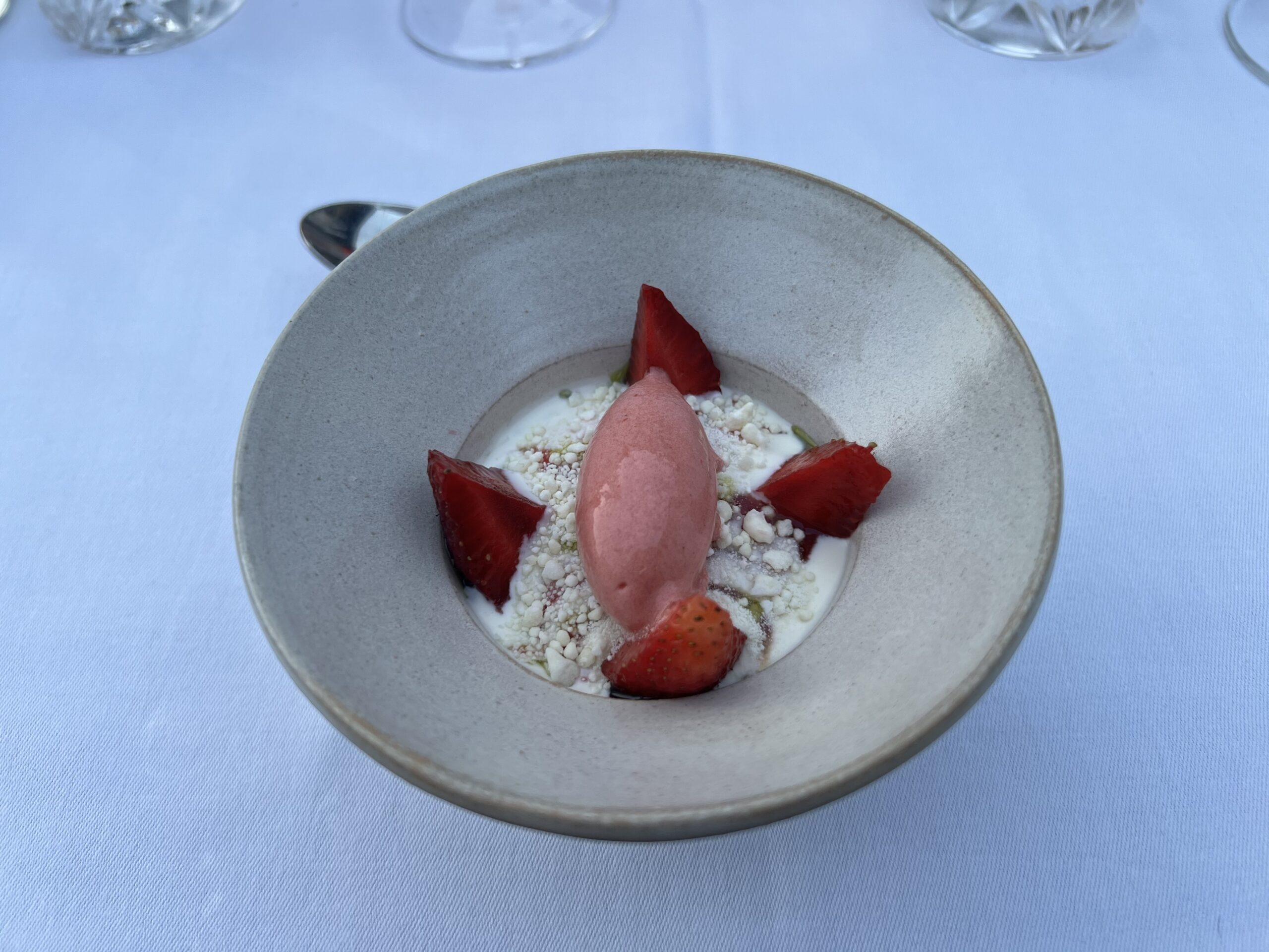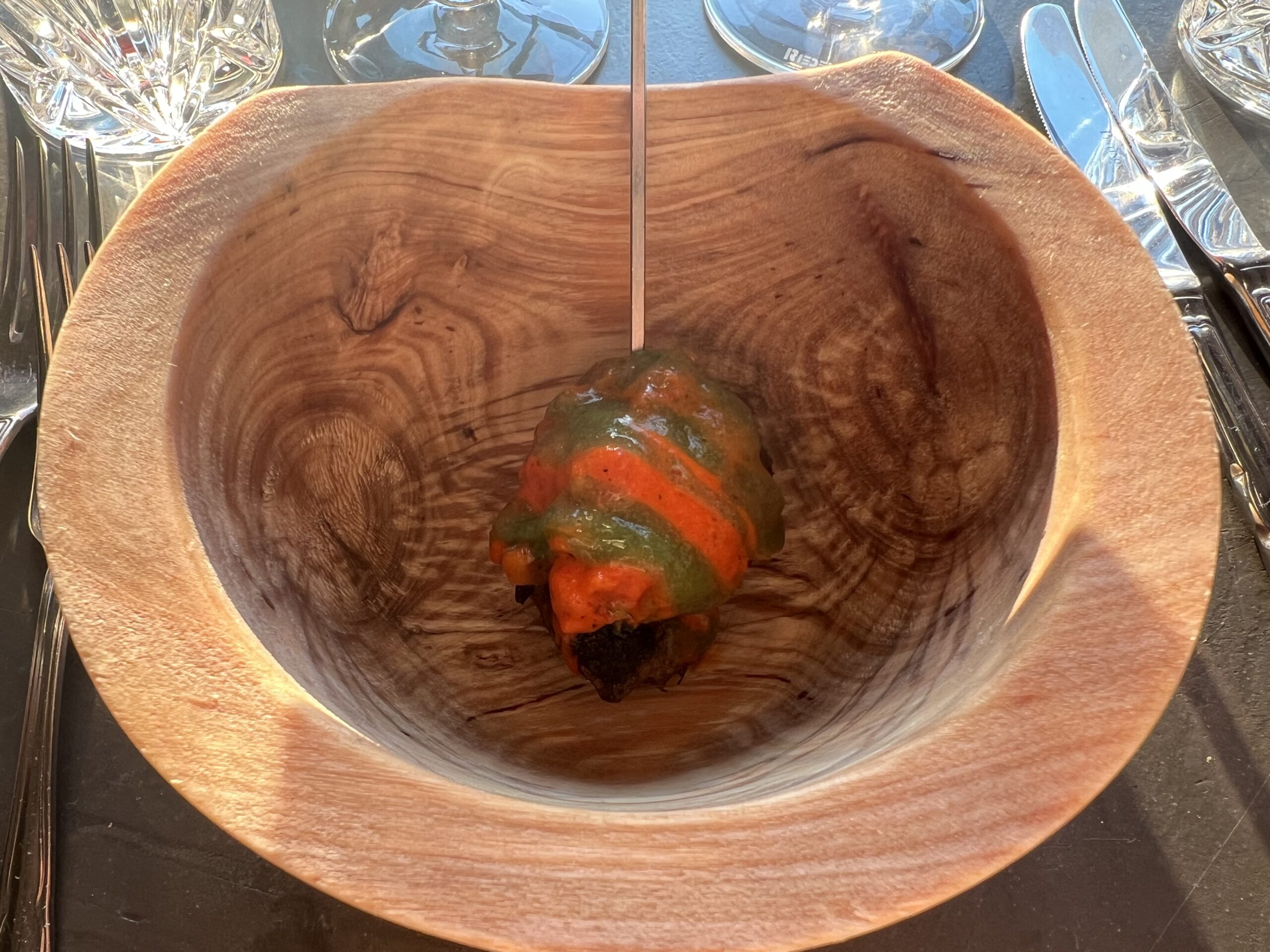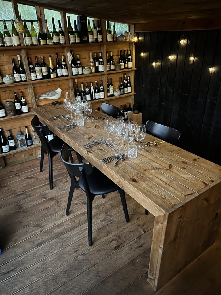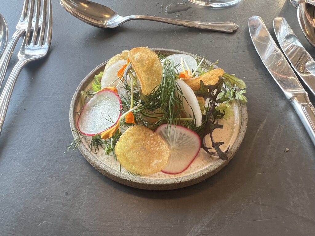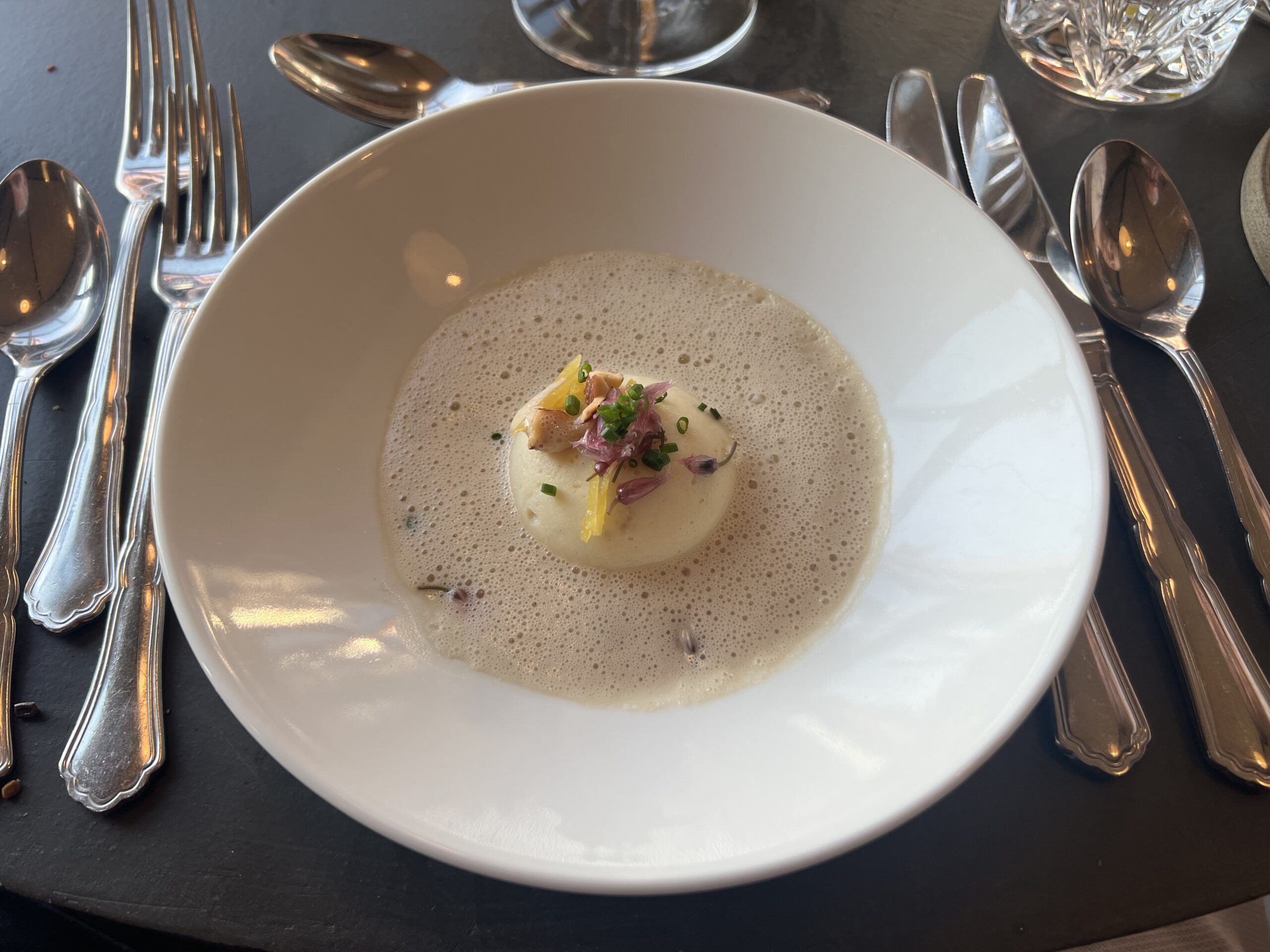 Ud over velkomstcocktail, bestemte vi os også for at tilføje med en “Den onde”-servering, Simons ”Velfærdslasagne” med et nederste lag – anrettet i en lille kaviardåse – af sorthummerklo med selleri og trøfler og oven på et lag med stegt foie gras, toppet med kaviar og masser af revet sorttrøffel. En lille smagseksplosion,. En ret der er hevet ind i restauranten fra “Gourmet Skuret”, som er en anden men garanteret kæmpe oplevelse ude bagved. Vi så skuret inden vi tog hjem, og det, derude, skal vi også op en dag og nyde en aften. Helt sikkert. Det var en super umami smagsoplevelse i øvrigt. Tag den gerne med hvis i kommer forbi. Jeg nævner den også, da den stadig økonomisk kan være med i vores maks beløb på omkring de 1500,- pr. person.