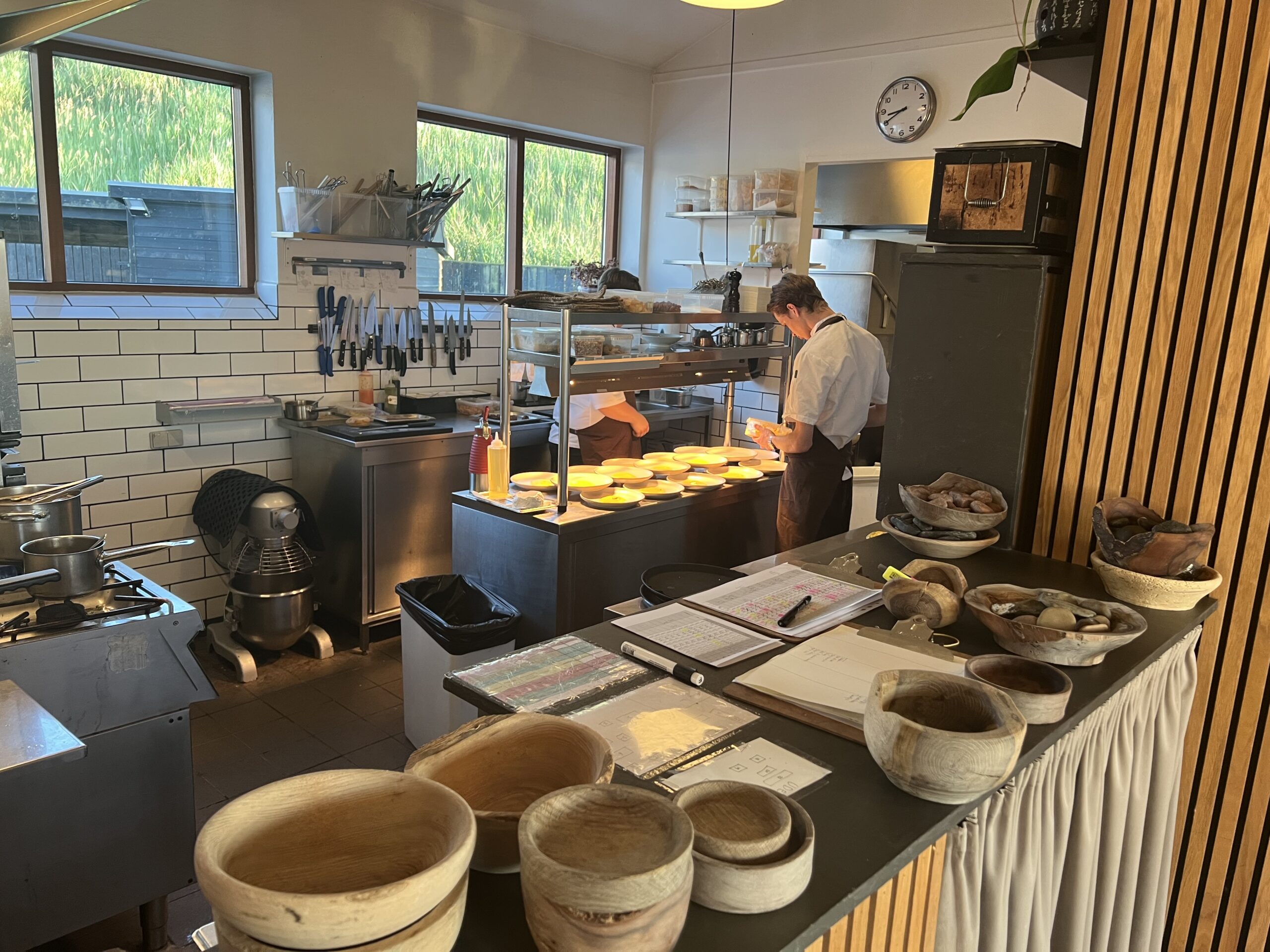 Om stedet i øvrigt: Med ti meter til kajkanten i det rå fiskeri-, industri- og færgehavnemiljø i Hirtshals ligger Restaurant Abstrakt – placeret i et 100 år gammelt tidligere maskinværksted, der i nyere tid også har huset bl.a. en Harley Davidson-butik. Siden 2017 har Simon og hans kone Kamilla imidlertid udviklet deres yderst afslappede gourmetrestaurant på lokationen. For et par år siden fintunedes Abstrakt-konceptet yderligere, da Simon korrigerede fra relativt voluminøse 3, 5 og 7 retters menuer til mindre, men flere nu 5, 7 og 10 serveringers-menuer. Til priser, der stadig nemt kan matche både Aalborgs og Skagens. Deres egen forretning har Simon og Kamilla de seneste år ladet brede sig til nu også at indeholde søsterrestauranten Konkret inde i Hjørring, som Simon har ladet en af sine dygtige tidligere elever stå for den daglige gastronomiske drift af.
