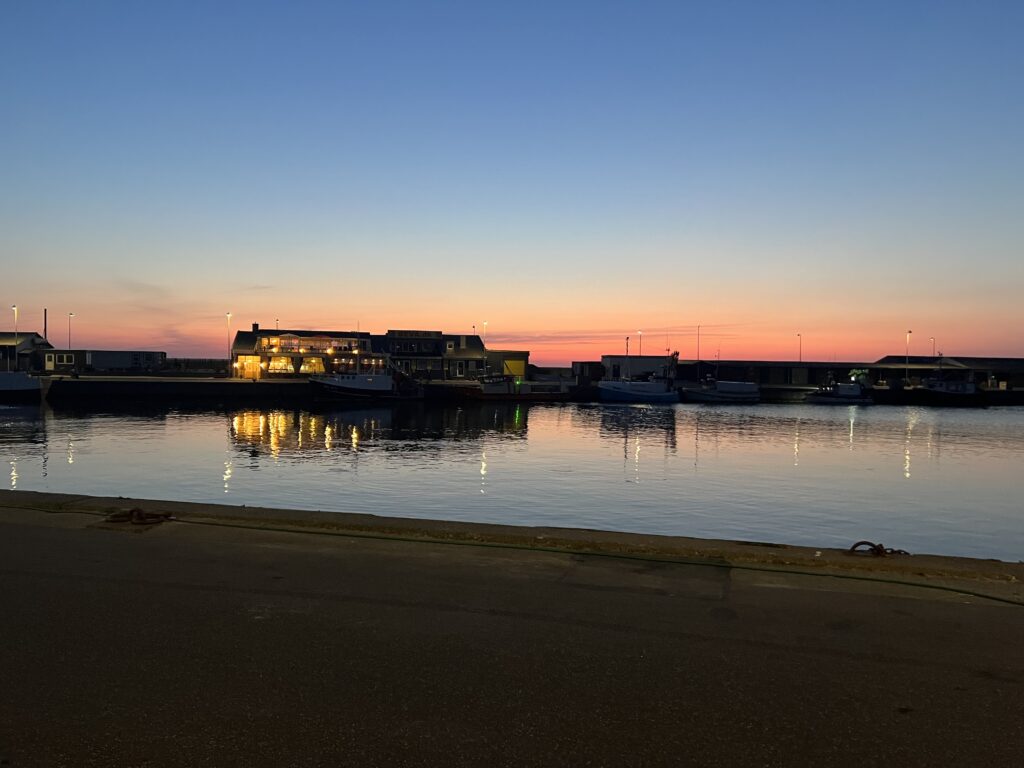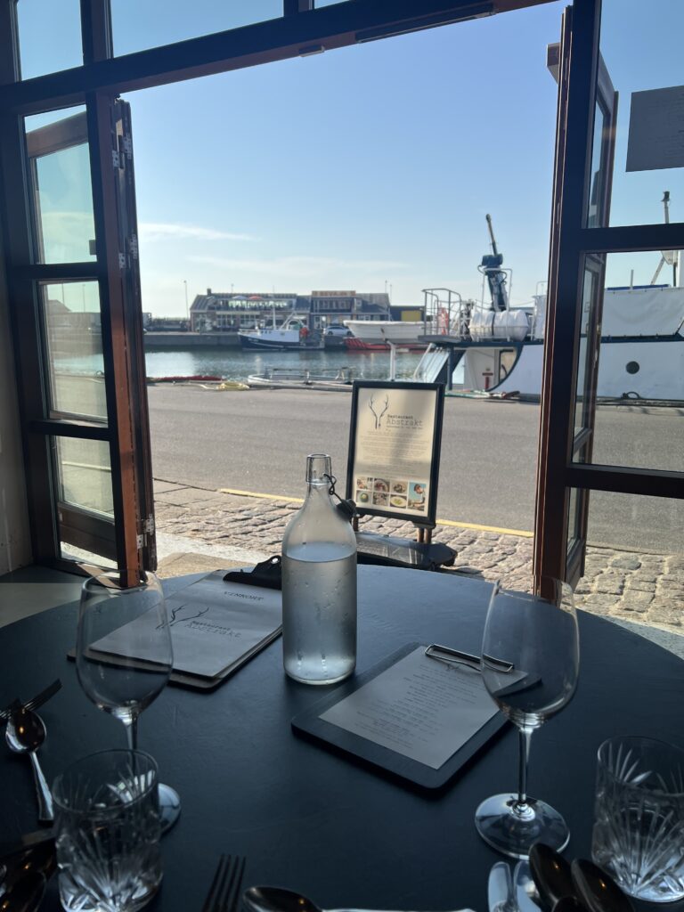 Stemningen var i top i byen Hirtshals, da vi ankom i bil og skulle finde et sted at parkere. Byen og ikke mindst havnen var fuld af liv og glade mennesker, og live-musik kom fra teltet, der i øvrigt lå ganske få meter fra vores destination: Simon Emil Schiøtt Christensen’s Restaurant Abstrakt på Hirtshals Havn! Så da vi spadserede fra bilen og over til restauranten, kunne vi nyde tonerne og summen fra byens “Musik under Trappen”-event. Det var superhyggeligt. Jeg har også besøgt Abstrakt engang for nogle år siden, hvor vi var de eneste der gik på havnen den aften.. det kunne også noget! Hver ting til sin tid.