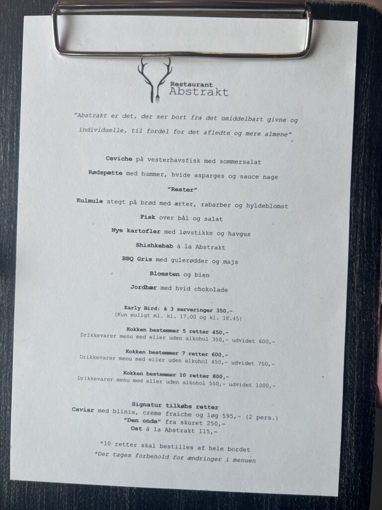 Pris fra menukortet: Kokkens valg – 7 Serveringer – 600,- (drikkevarer menu med eller uden alkohol 450,- udvidet 750,-) så i alt kr. 1.050,- (plus “Den onde” blev det så 1.300,-).